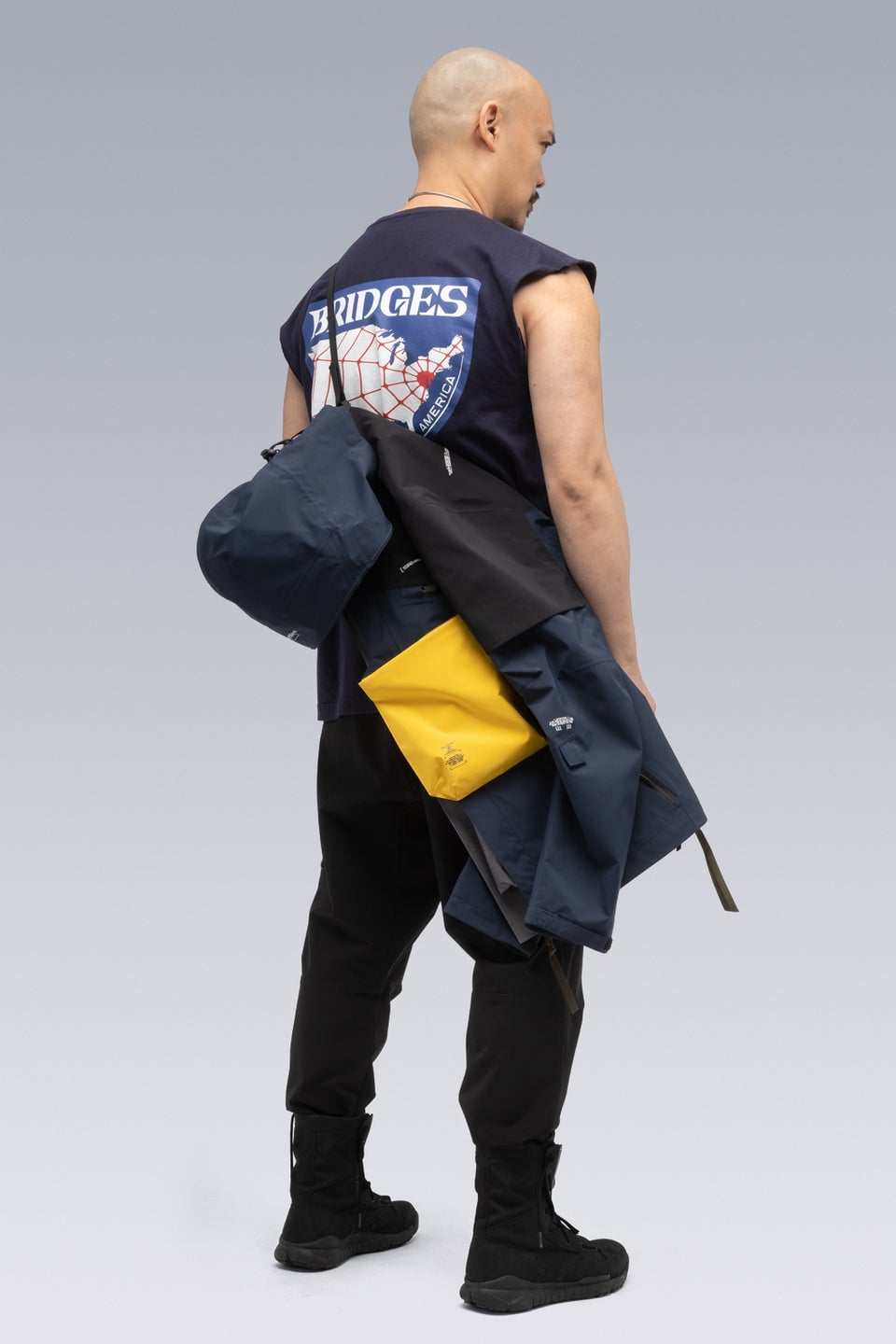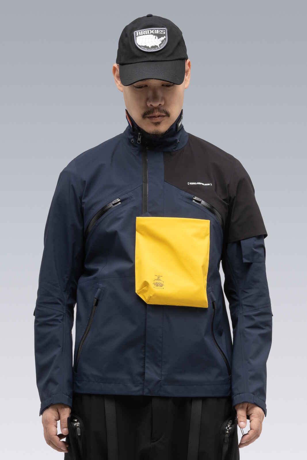 This particular jacket isn’t one of those pieces, it’s just one of Acronym’s most famous jackets—the J1A-GT—done in a Death Stranding style in honor of their collab, with the signature chest pocket done in yellow to mimic the baby jar and some Bridges logos on the chest, arms and back.