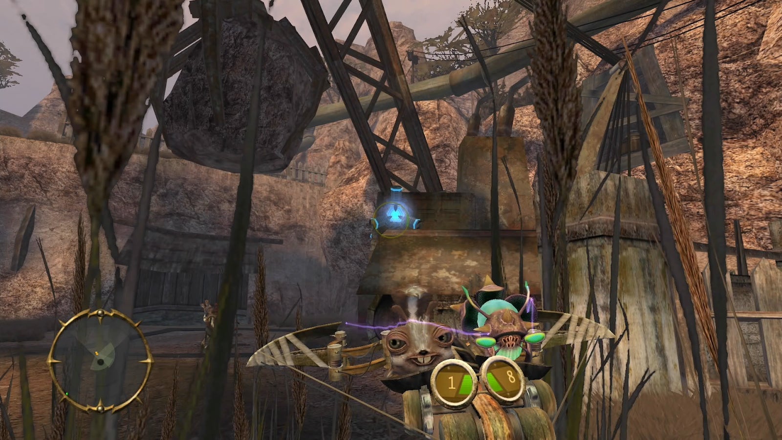 Guns exist in Stranger’s Wrath, but Stranger eschews them. His weapon of choice is a dual-chambered crossbow that fires literal live ammunition. As our hero wanders the land hunting bounties, he picks up small creatures that can be fired from his crossbow, resulting in various effects. Spidery Bolamites wrap enemies in webs, temporarily incapacitating them. Chippunks attract enemies, making them perfect bait for traps. Zappflies carry an electrical charge that can be used to activate switches and zap bad guys.