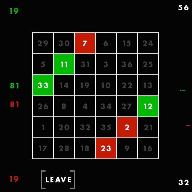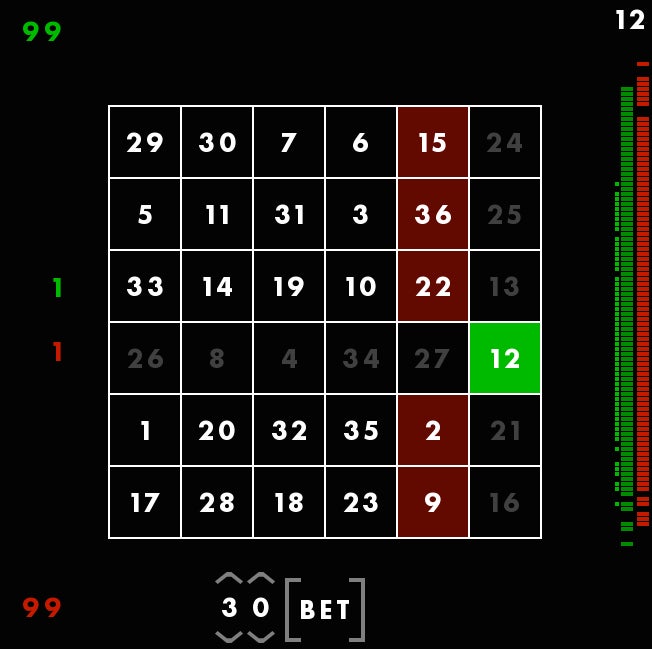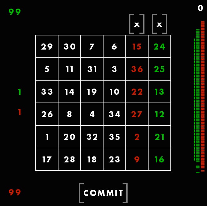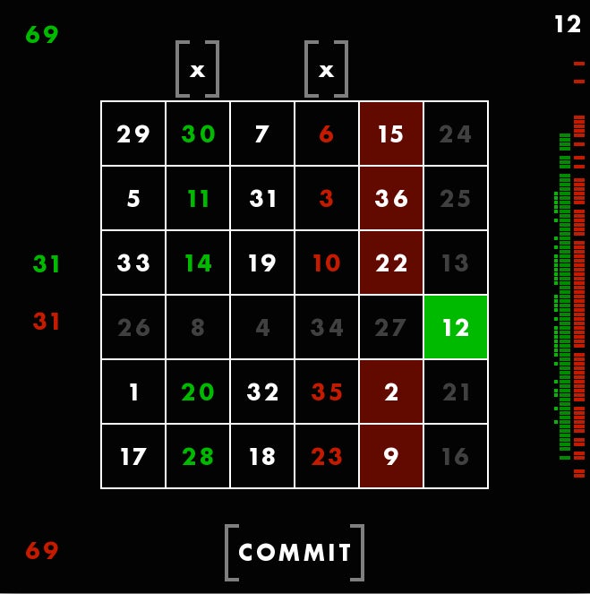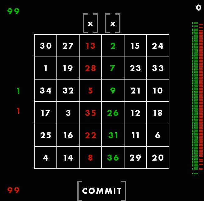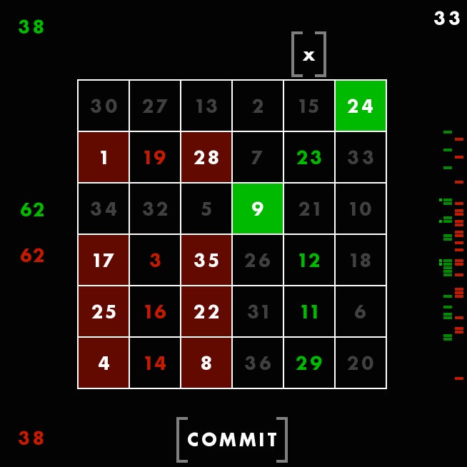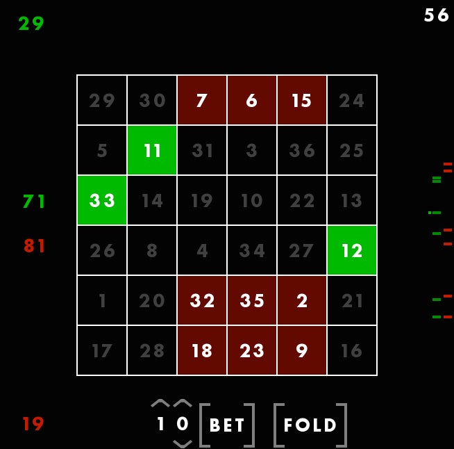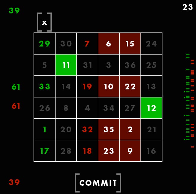 First, youāre seeing a magic square, with all columns and rows adding up to 111. The square is different each time, but always adds up the same way. Though these columns are, in a way, random, Rohrer told me he still feels that they each give the player a fair shot at winning. Thatās why he considers this a game of skill. You canāt be, say, dealt a better hand and then just win by doing nothing. You have to make moves using the square. You have to use skill.