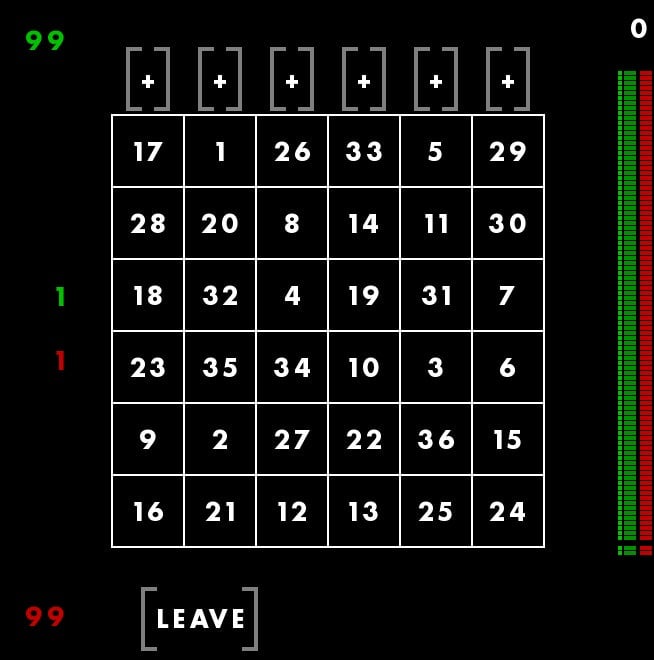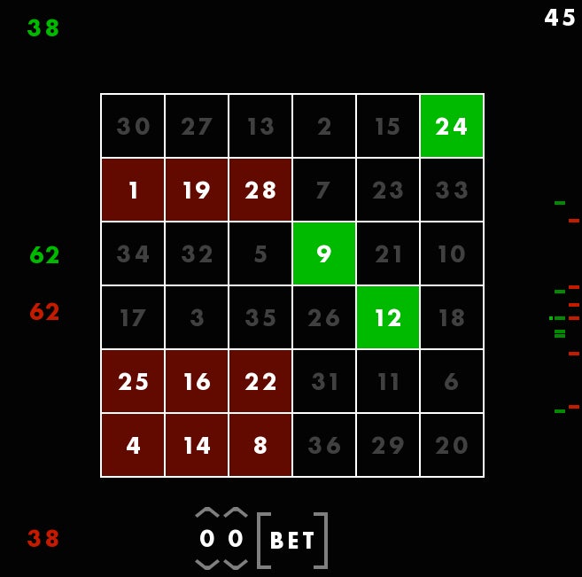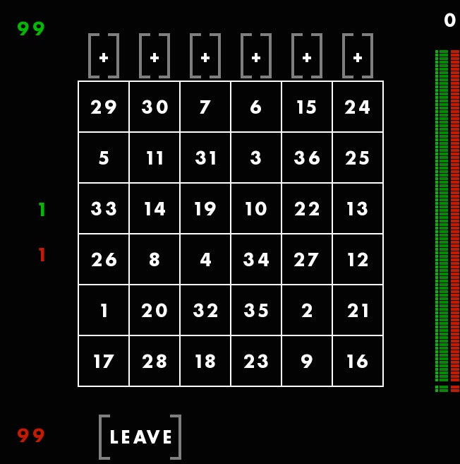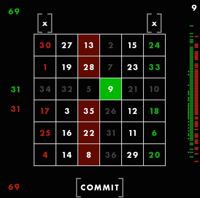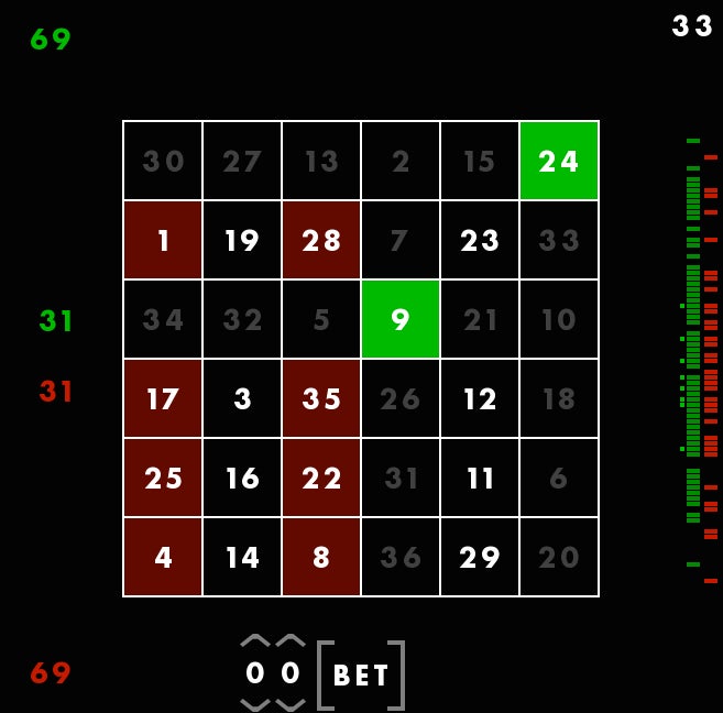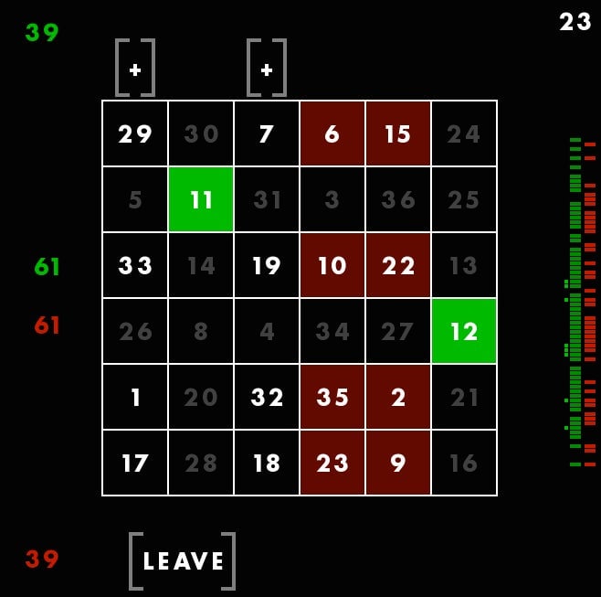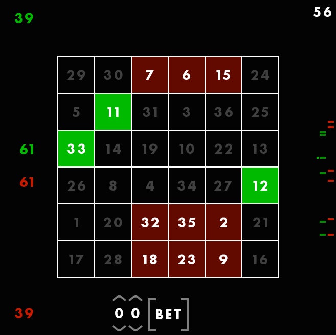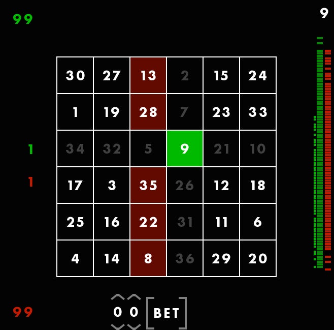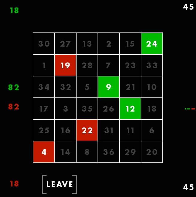 First, youāre seeing a magic square, with all columns and rows adding up to 111. The square is different each time, but always adds up the same way. Though these columns are, in a way, random, Rohrer told me he still feels that they each give the player a fair shot at winning. Thatās why he considers this a game of skill. You canāt be, say, dealt a better hand and then just win by doing nothing. You have to make moves using the square. You have to use skill.