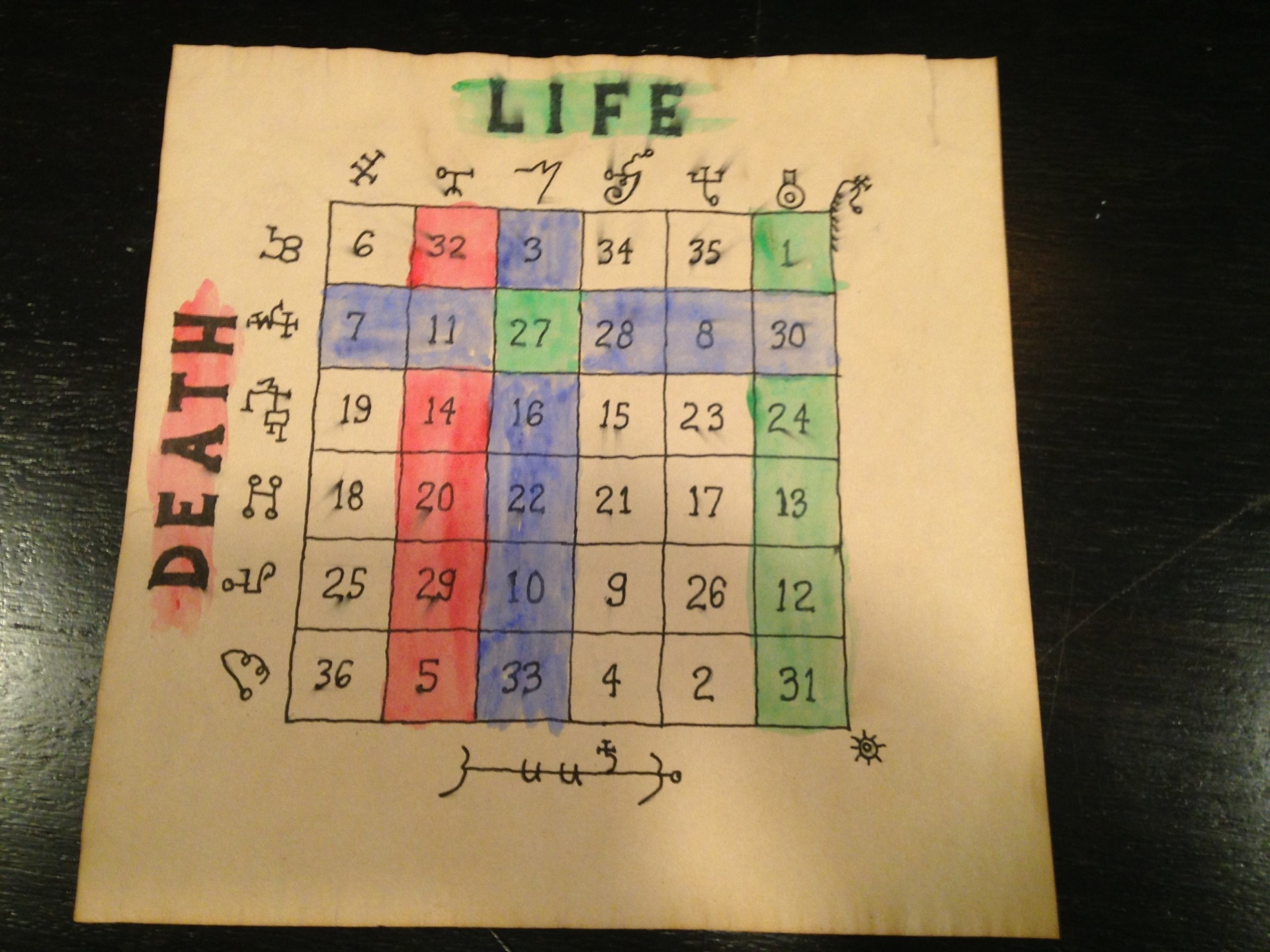 On the right, the red lines show his potential scores. Since heās in the same predicament on his end, he doesnāt know that Iāve earned a 12. He just knows that Iāve earned one of five possible numbers in the row that, for me, starts at 26 (remember, itās a column for him). The potential scores that he sees for me are indicated on my screen as green lines (red lines on his).