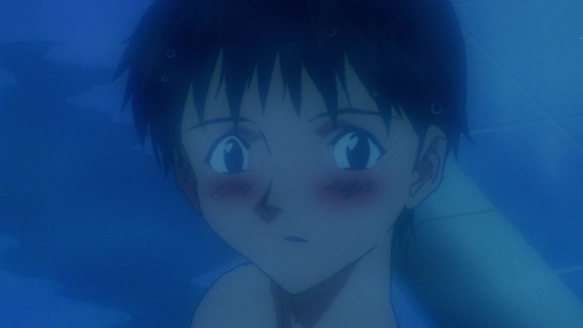 Kaworu is slated to be the latest Eva pilot, and he and Shinji form an intimate bond. In an episode just before the end of the series, Kaworu connects with Shinji when he’s shut just about everyone else out. After Shinji and Kaworu practice in their giant mechs, where Kaworu demonstrates inhuman ability at piloting, he and Shinji head to a bathhouse where they talk about their feelings in the nude. Eventually, Kaworu starts talking about the nature of humanity, and the two share what’s in their hearts.