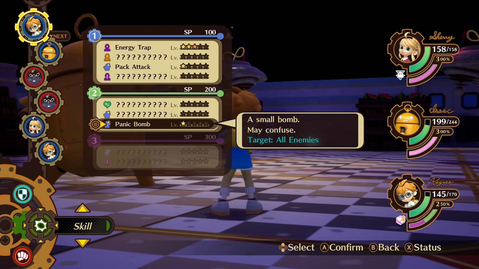 It keeps getting better from there. The battles are simple at first, little more than waiting my turn to hit the attack button, but soon Sherry and friends begin learning special skills, defining their roles in combat and unlocking new strategic choices. Pegreo, for instance, is a timid, fearful character who follows Sherry into battle out of loyalty when itâs obvious heâd rather flee. His moves reflect his personality; for example, his Panic Bomb ability harnesses his fear into a massive attack against all enemies with a chance to cause confusion. His love of gadgets shines in skills like Energy Trap, a device that damages an enemy whenever they use one of their own skills, perfect for boss battles.