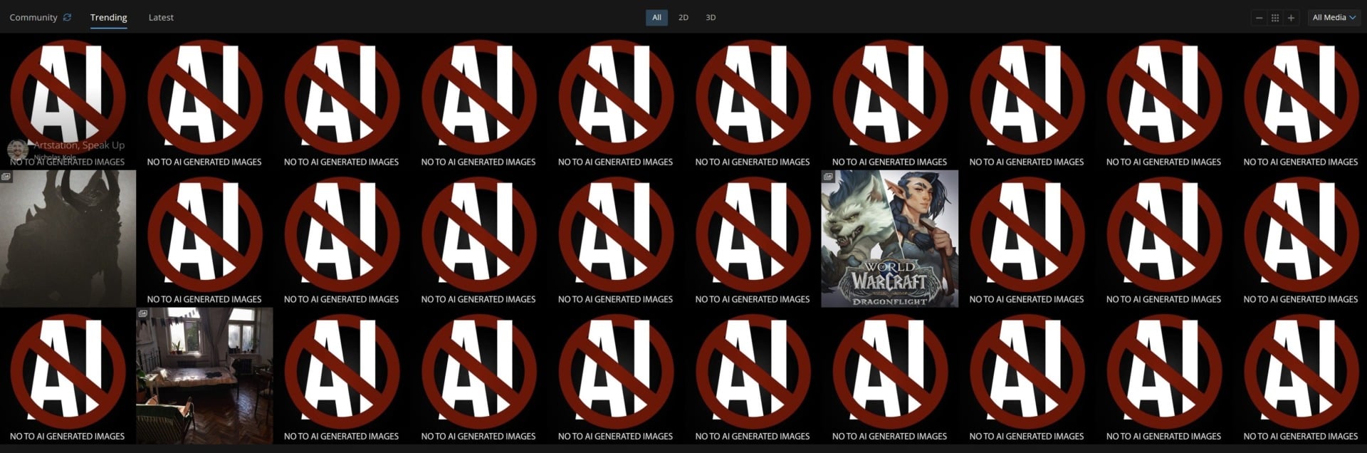 It’s just the same image, originally created by Alexander Nanitchkov and saying “No To AI Generated Images,” pasted over and over again by hundreds of artists: