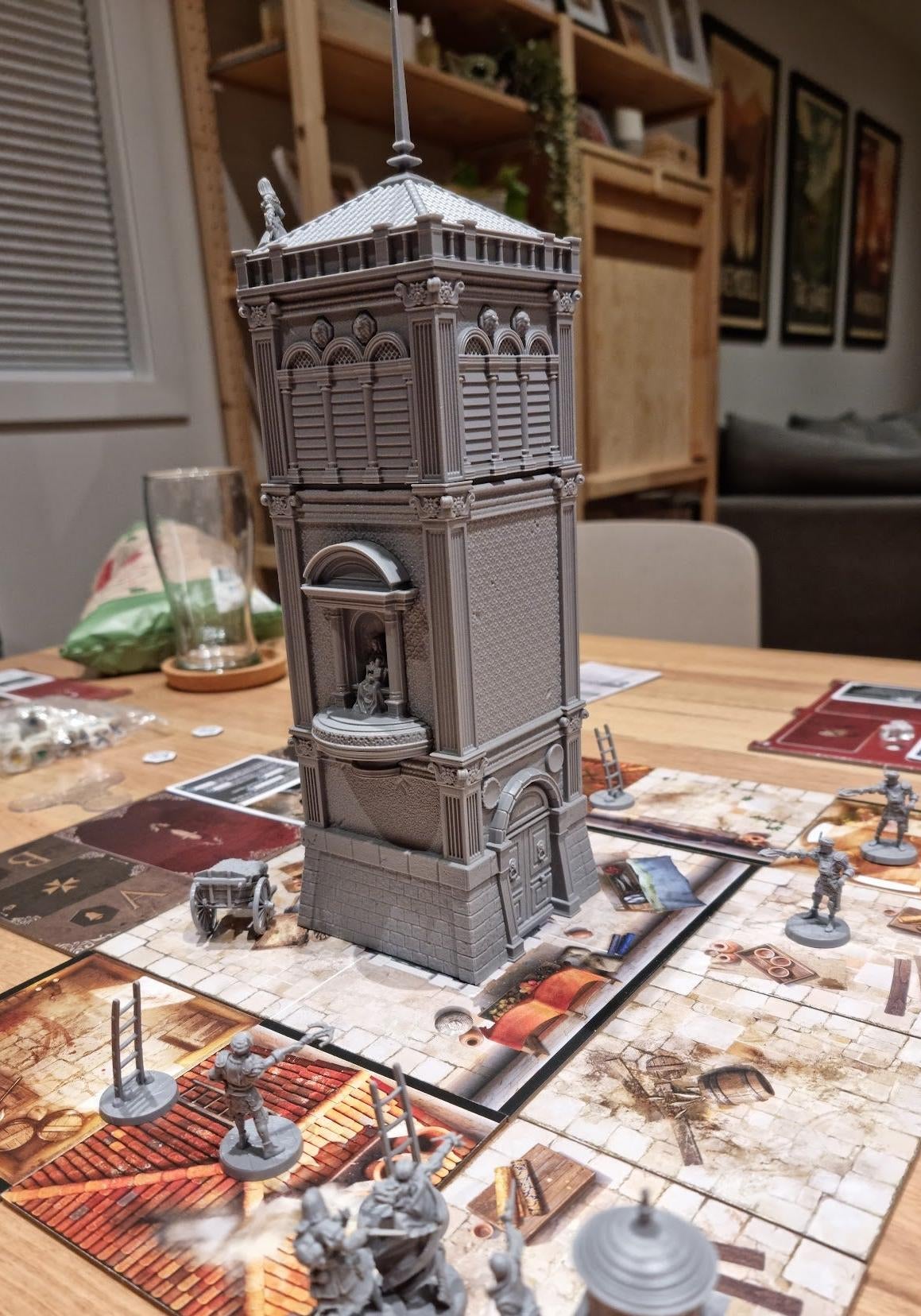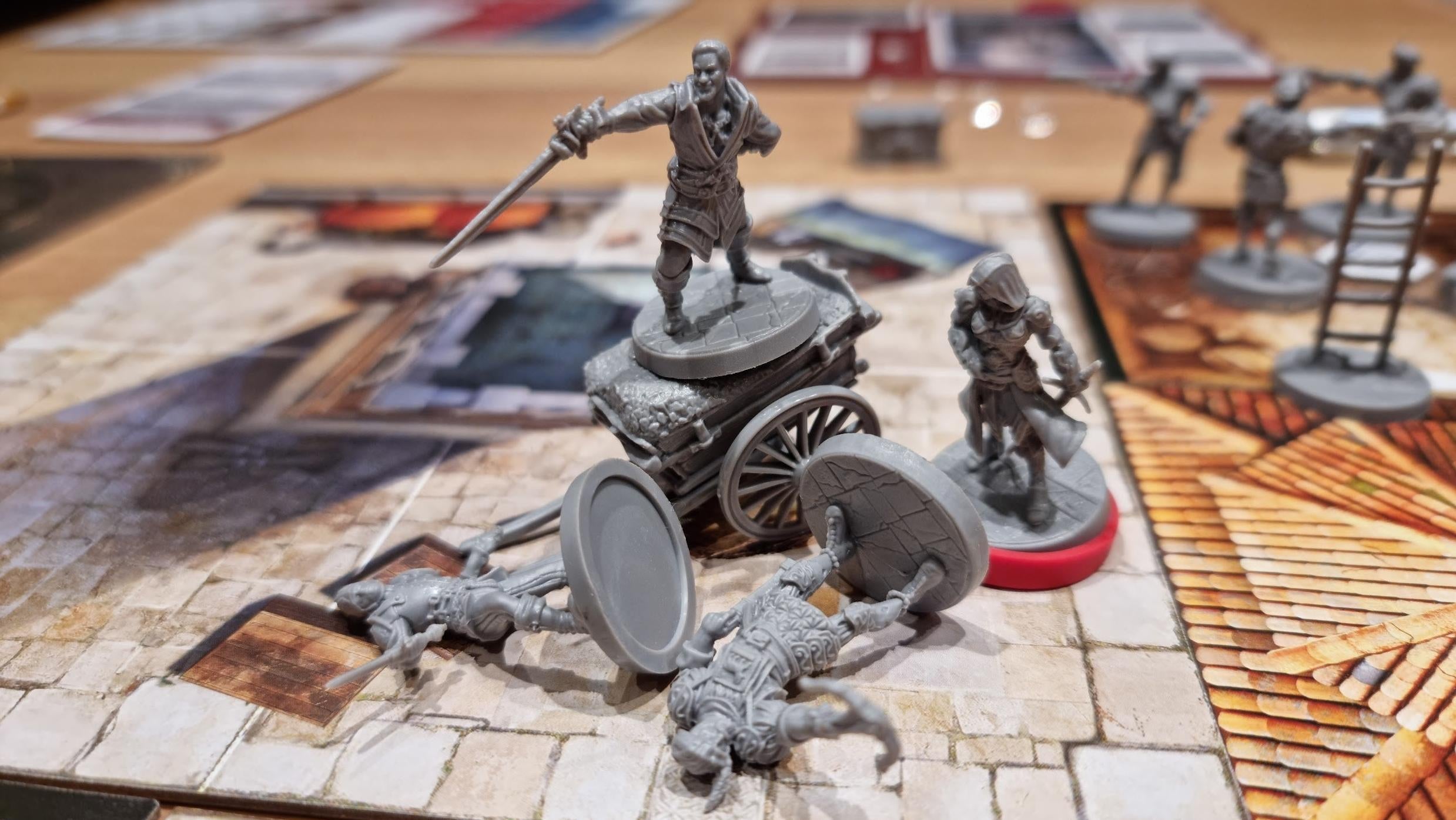 Which is a damn shame! Because as far as the game itself goes, I loved it. I love how smart and snappy it plays, and how elegant the enemy system works, and because I haven’t mentioned it yet I also really liked the way this game is just a pleasure to be around. It’s easy to make fun of the amount of plastic miniatures used in licensed board games these days, but Brotherhood of Venice uses its guards, ladders, chests and [spoilers] to great effect. Nearly everything you do in this game is represented by a token or miniature, which gives the game a great sense of physicality, while the map tiles and card art are rich and vibrant and slot in seamlessly alongside what you’d be accustomed to from the video game series.