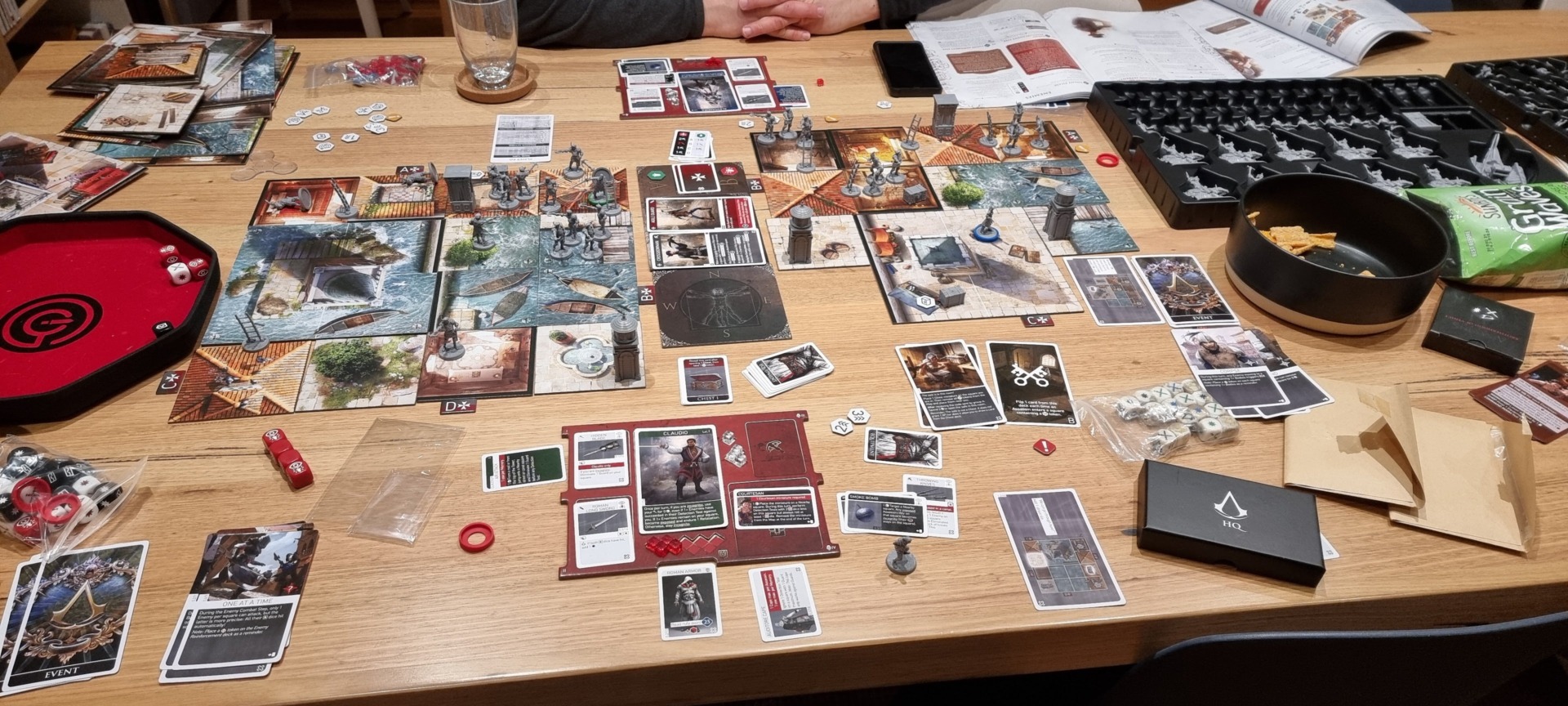 The thing is, in trying so hard to play just like the video games on the tabletop, Brotherhood of Venice has managed to let some of the franchise’s bloat and tedium creep in where this medium could and should have actually kept things leaner. Basically, I found this game too big. It’s too big literally, coming in a comically large box, and when unfurled taking up an enormous amount of space on the table, with Assassin player mats, a game map or two, multiple decks of cards, some other big mats for enemies and a compass, a huge HQ tile with its own cards, stacks of envelopes containing the game’s missions…it’s an enormous task setting this game up, and an even bigger one packing it away and keeping things organised so you can play it again.