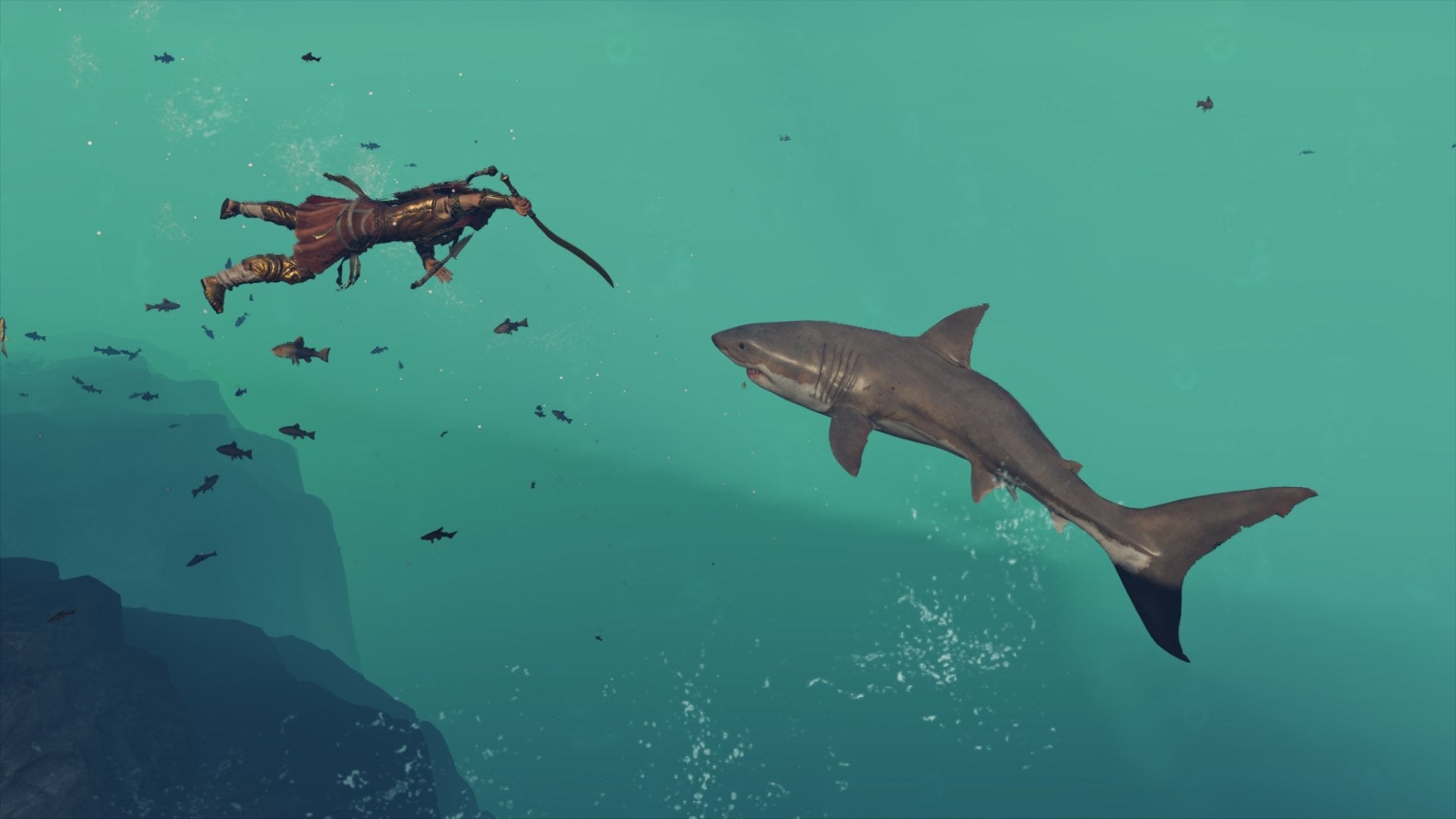 It’s got to the point where I’m actively avoiding missions involving diving into the ocean, and on any quest where I have to get down there, I’ve been…trying to stand on a boat and shoot arrows at the sharks from the surface.