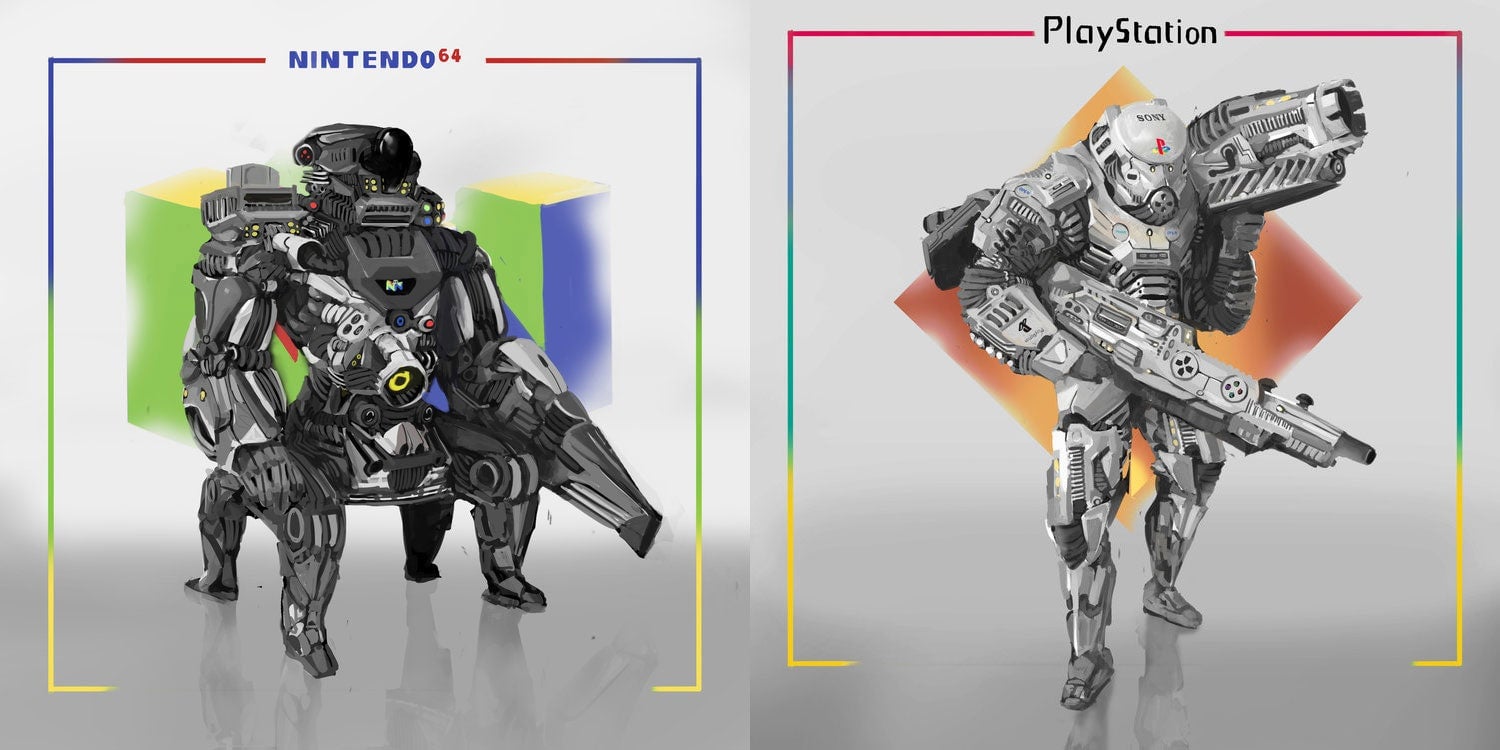 Ah yes, the Nintendo 64 and Sony PlayStation, machines we remember best for their ability to *checks notes* fire devastating plasma beams and railgun blasts out of their arms. These are the work of artist Gerald Gordge, and you can see more of his stuff at his personal site