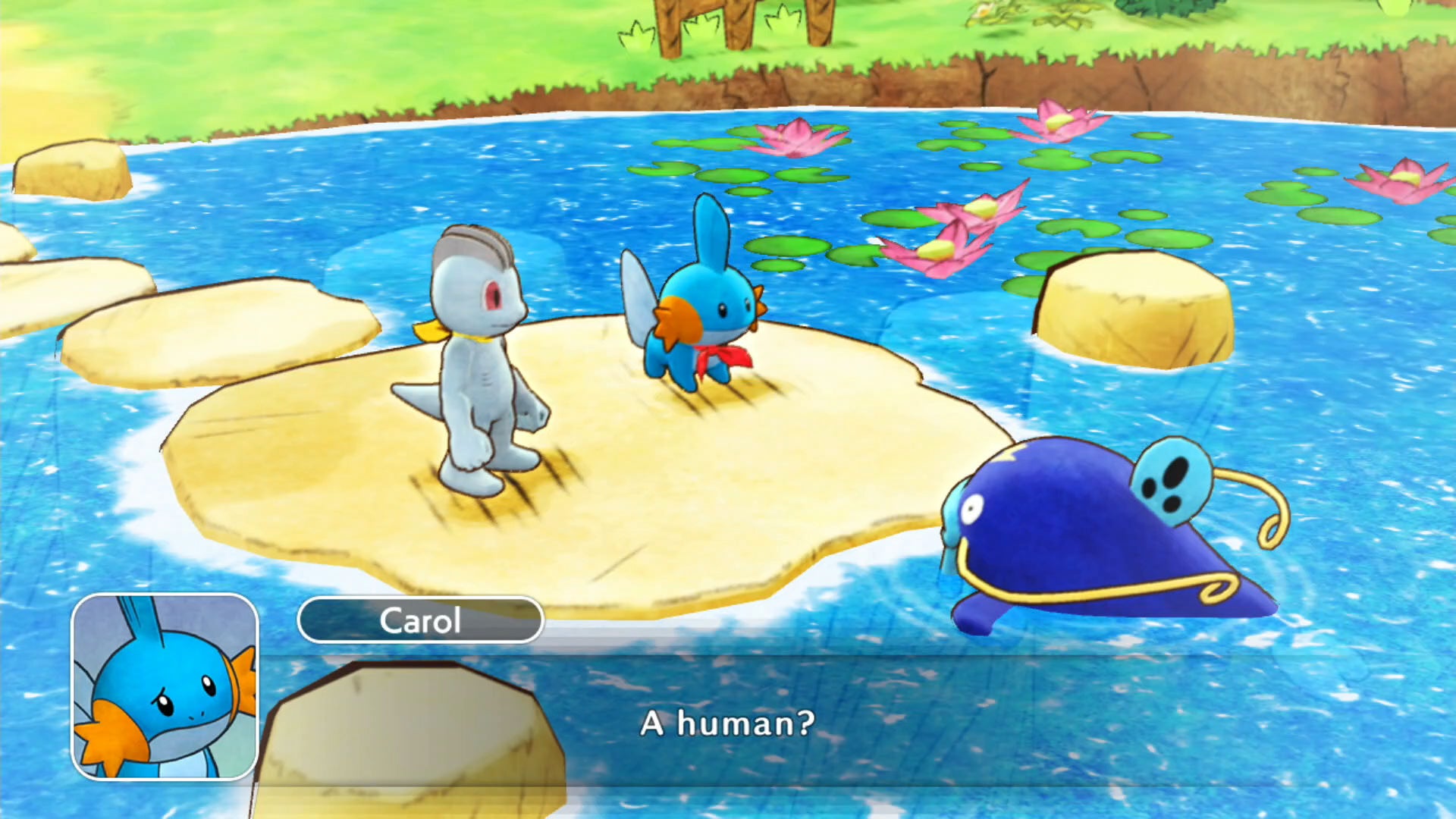 I don’t usually name my Pokémon. Since the days of Blue and Red, I’ve resisted giving my pocket monsters nicknames. What’s the point? One Mudkip is the same as any other Mudkip. But not in Pokémon Mystery Dungeon: Rescue Team DX. The Mudkip I’ve partnered with in the roguelike remake is a unique character. She has ambition. She possesses a selfless bravery. She never leaves my side, despite knowing I am a human in the body of a Machop.