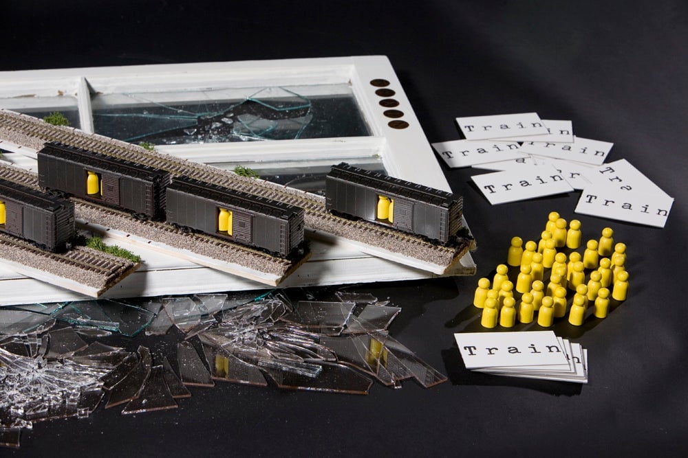 In Train the player is presented with a set of miniature train tracks and sixty small yellow pegs that represent people. The player is asked to efficiently load those people onto the trains. You can follow the rules, if you wish, but maybe you donât have to. At the point at which the player successfully completes the game they overturn a card that reveals the trainâs destination: Auschwitz. The high of winning is immediately punctured with the stark realisation that they have been complicit in loading Jews onto box cars (one yellow peg represents 100,000 Jews) en route to the infamous concentration camp where 1.1 million were killed in the gas showers or burned in the ovens during World War II.