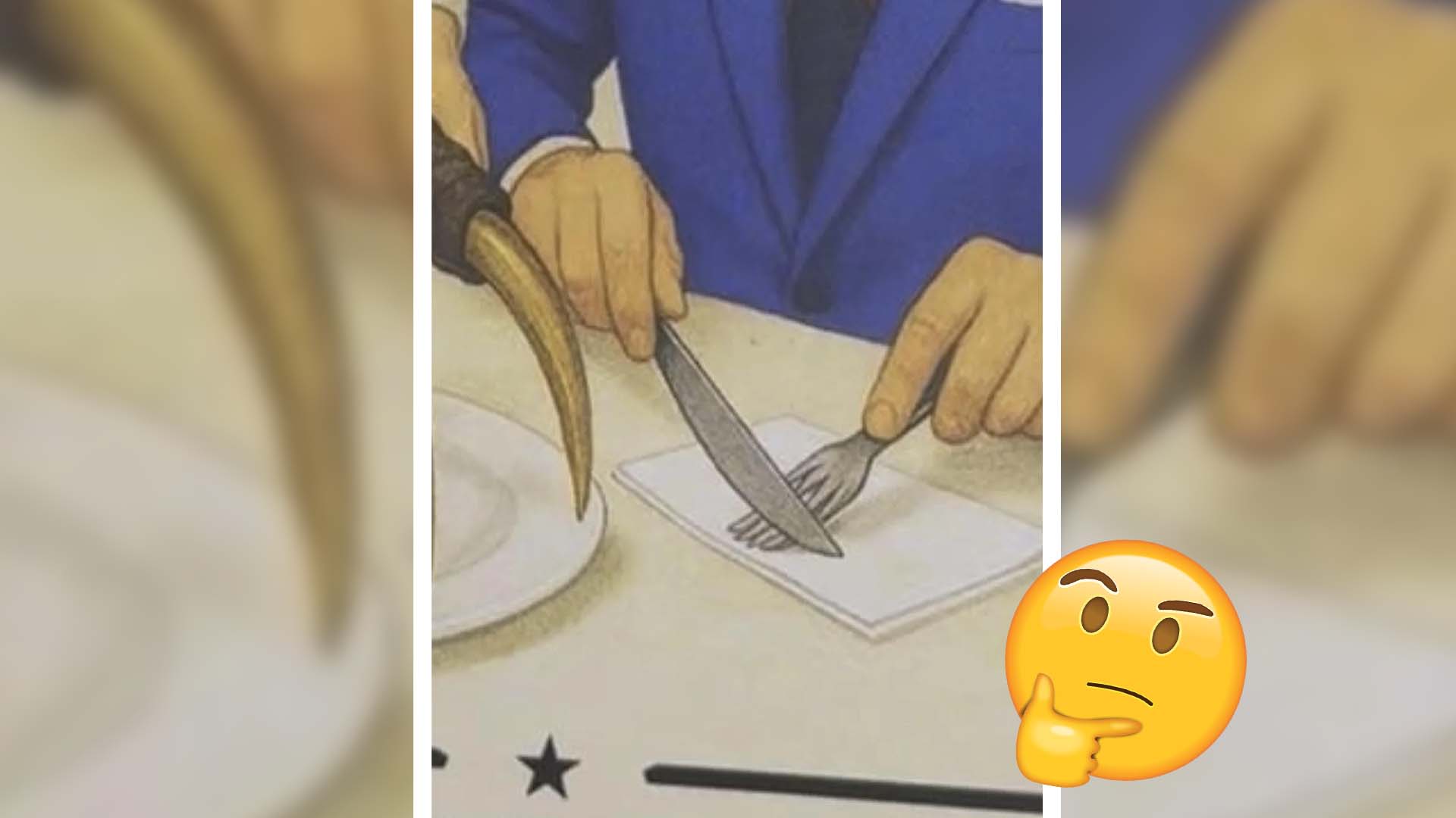 A man cutting a napkin with a misshapen fork seems a bit odd, even for the Fallout universe