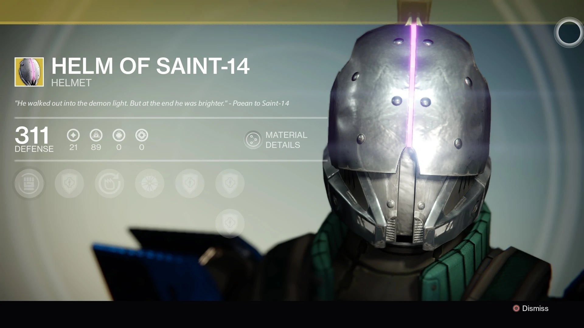 “He walked out into the demon light. But at the end he was brighter,” reads the description of his helmet, a Destiny year one exotic players grew attached to because of the blinding effect it added to Titan’s bubble shields. That helmet helped ward of enemies while players healed up inside. Through the helmet’s utility, the character became a symbol of courage and protection.