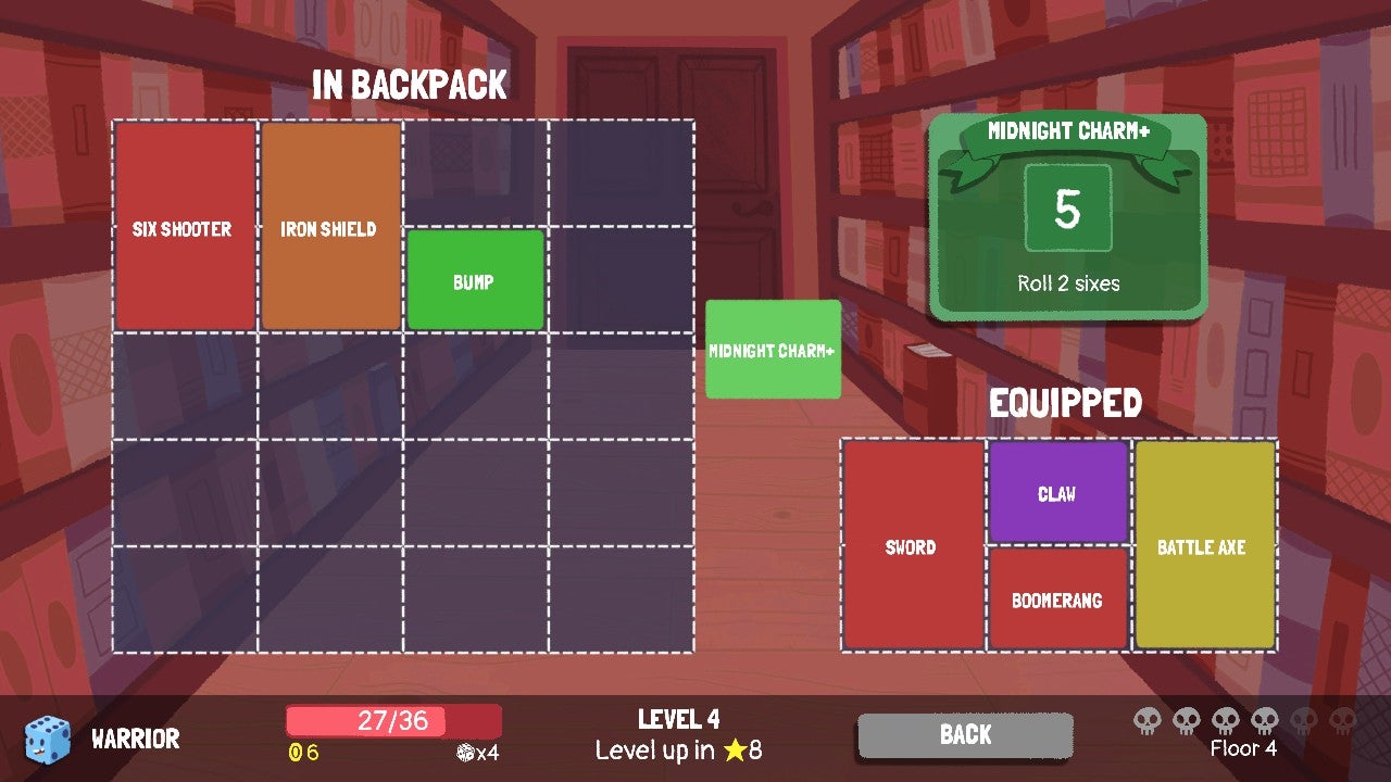 Battles are turn-based, and at the start of every turn you roll a certain number of dice depending on your character and their level. These dice, with rolls between one and six, can then be used to trigger abilities based on the cards you have equipped. The warrior’s regular sword card does damage equal to the die you put on it, while the crystal sword card does three times the damage of the die you put on it, but only dice with rolls of five or six can be used to trigger it. At the end of the fight you’ll get gold, which can be spent on purchasing new cards or upgrading existing onesl. Defeating enemies also earns experience points which help you heal and add extra dice.