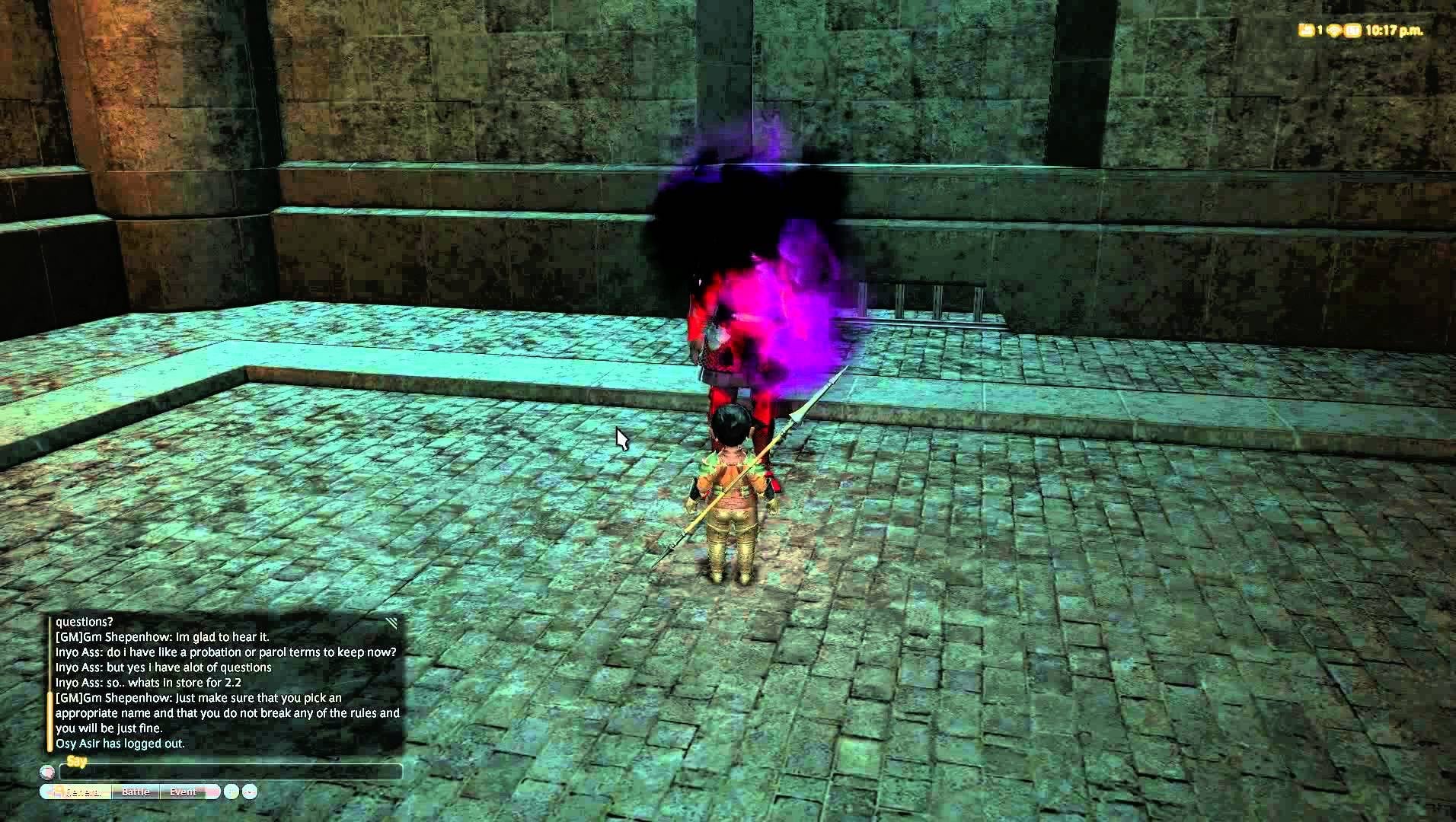 Inyo Ass, a tiny Lalafell fighter, was standing around in the Vesper Bay zone when he saw a Game Master. âDamn, I saw a GM,â he said to his Free Company chat before, suddenly, he was extracted from the zone. Then, he found himself somewhere heâd never been before. It was a prison. Gray cinderblocks made up the floor, and the walls were dark, lit by small torches. Standing before him was an imposing figure, obscured by a fiery purple mist.