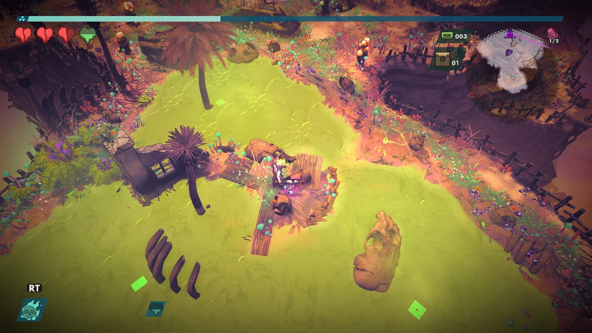 Despite Rad’s bright colors and environments full of hair-band personality, navigating the map got stale quickly. Each level has a number of statues you need to activate to unlock the gate that lets you leave the level. Once powered up, the statues emit a glowing laser that points the way to the exit. It’s unfortunately hard to see that laser given the game’s static isometric camera, though its direction is at least visible on your minimap. Finding all these statues almost inevitably requires going into the bunkers, which connect via different-colored teleporter pads. I spent more time than I wanted to wandering through the tunnels, trying different teleporters and looking for entrances to parts of the network I hadn’t accessed, all in hopes of coming out in a new part of the map and finding the last machine. Exploring the level to find mutations and get rads from killing enemies is part of the fun, but wandering around to pick up that last machine is not. As you activate machines, you sprout flowers in your wake to let you know where you’ve been, but repeated backtracking through dead ends made this navigational tool just one more reminder of how lost I’d gotten. Often, this wandering also meant losing health to enemies, health I’d hoped to preserve for each level’s final boss fight.