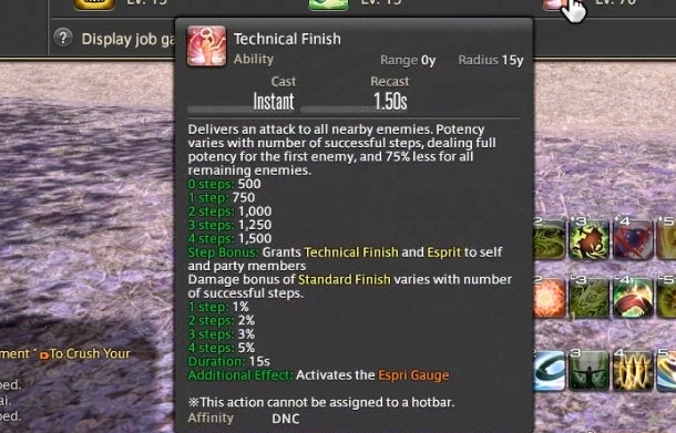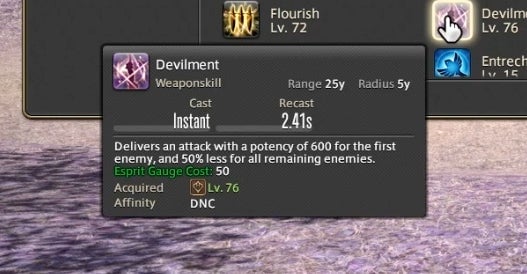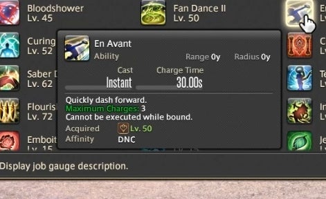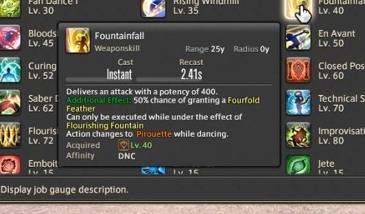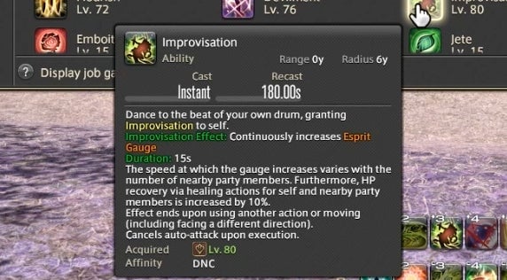 That’s already a lot to keep track of, but there’s one final meter that Dancers need to watch. Whenever a buffed player or teammate lands a weapon skill attack, it builds up resources in a small bar called the Esprit Gauge. Once the gauge reaches 50 or above, a powerful finishing attack becomes available. There’s also an ability called Improvisation that slowly builds the meter without the need to land attacks.