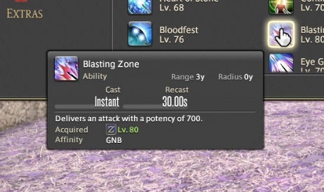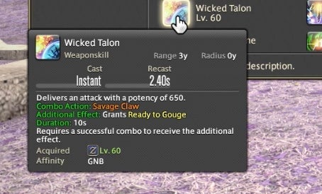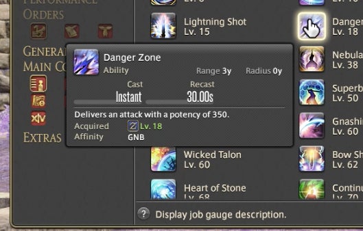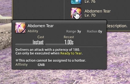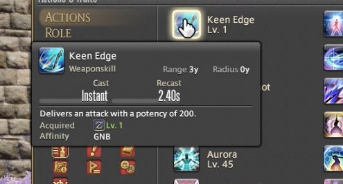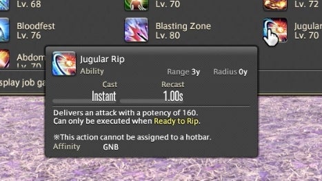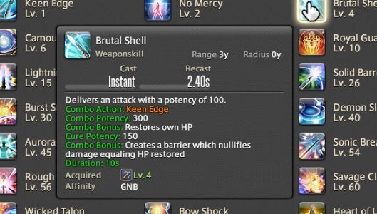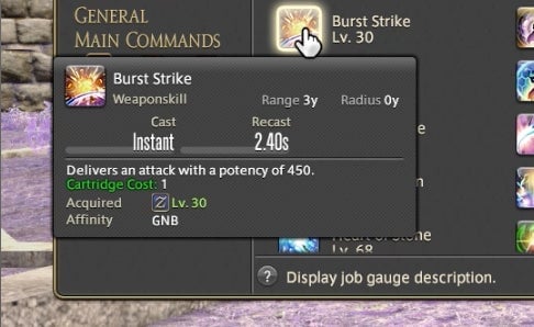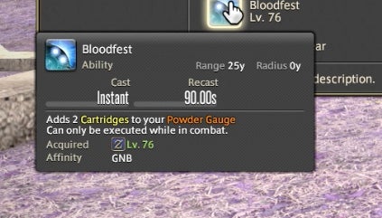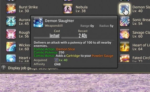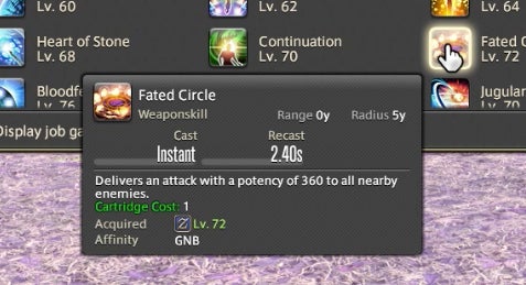 The Powder Gauge can store “cartridges” that are spent on special attacks. You earn cartridges by performing basic attack combos. Cartridges can be used on boosted versions of normal attacks—for instance, the circular Demon Slice can be replaced with the explosive spinning slash Fated Circle—or you can use them to access a long combo chain. That combo chain is what made Gunbreaker incredibly rewarding to play. This is thanks to an ability called Continuation.
