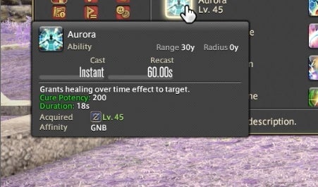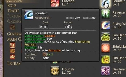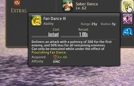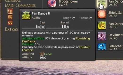 Dancer can also attack using a variety of long range single-target weapon skills and close range area of effect abilities. These abilities have a chance to trigger new attacks in a combo chain or, in the case of certain attacks, grant a resource called Fourfold Feathers. These feathers can be spent on powerful abilities that use the Dancer’s fan to strike with a magical burst. The idea is to attack and run through combos as they trigger, using Feathers on special abilities whenever you gain them. As a result, attacking as a Dancer is partially driven by random chance. You have a 50% chance of gaining Feathers on most abilities, so Dancers are required to react in the moment and improvise based upon their luck. A high level ability called “Flourish” enables all attacks regardless of if they’ve triggered, but it has a one minute cooldown. This means that you can sometimes cut loose and do whatever you like, at least from time to time.