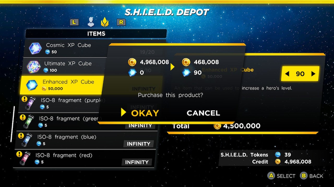 S.H.I.E.L.D. Tokens earned from running through Gauntlets or playing the game in Nightmare mode can purchase a limited amount of powerful XP Cubes. Players can also purchase the mid-level Enhanced XP Cubes, but only with gold, which can be earned by playing through the main game (regular players likely have a surplus of it by now). A batch of 90 Enhanced XP Cubes took my newly unlocked Moon Knight, who joins the alliance at around level 26, all the way up to level 55. Which is good, because I need his brawling skills in Gauntlet mode.