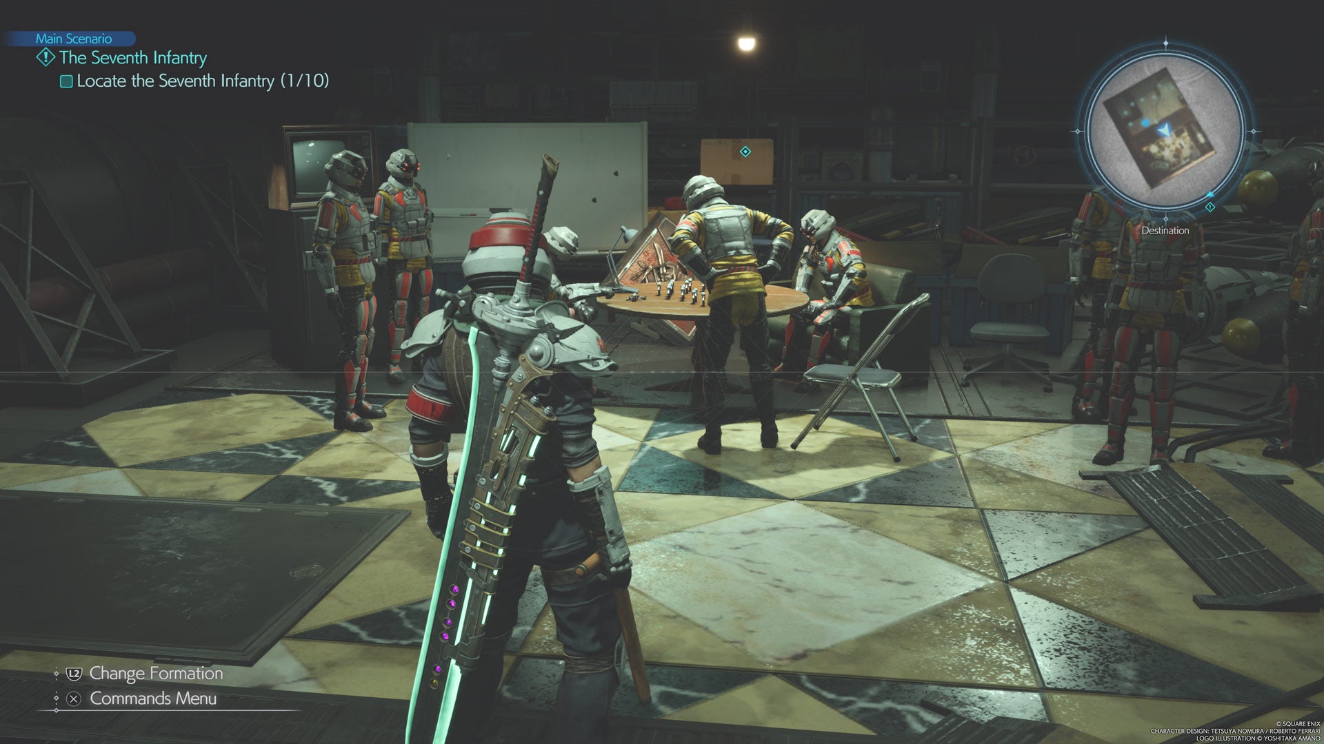 This location contains a nice reference to a strange collectible from the original Final Fantasy VII. Head down to the lower level of the Larboard Garrison and you’ll find a group of Seventh Infantry personnel standing around a table full of mini-soldiers…one might say, 1/35th scale.
