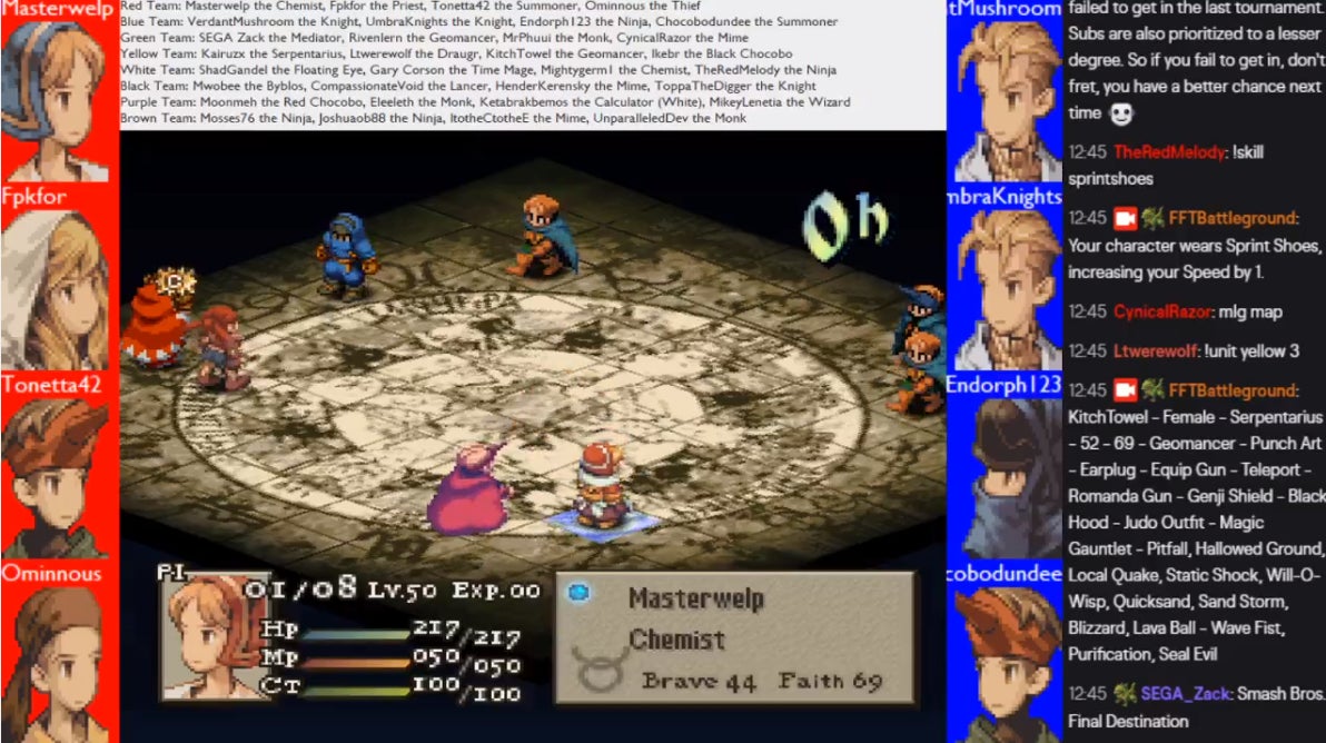 There’s no reward beyond bragging rights and getting to see your name climb up the leaderboard, but somehow that’s been enough, at least for me and the 150-something other people tuned into the stream at any given time. Watching FFT Battleground is like seeing a fever dream version of Final Fantasy Tactics where weirdly tinted sprites fight for their lives using busted movesets in ways that are sometimes sublime, sometimes trainwrecks.