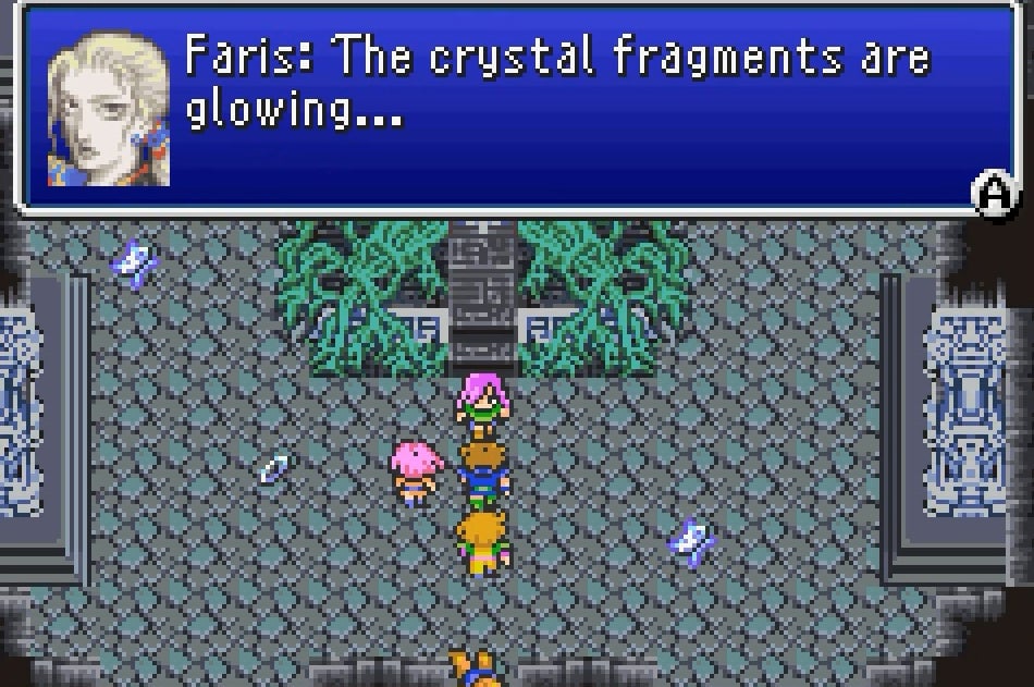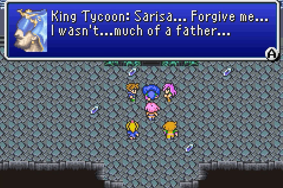 So thereâs something deeply moving in the quest of the two sisters, Faris and Lenna. Theyâre trying to find their father, King Tycoon, who is being controlled by a mysterious force. The burgeoning relationship between the two sisters is touching, especially since it follows the death of Farisâ sea dragon Syldra. I love the visits the party has back to Tycoon and the flashbacks the two sisters have of each other. Theyâre simple, but convey a whole lot of emotion even though the dialogue is sparse. I could sense the feeling of loss for everything theyâd missed in each otherâs lives.