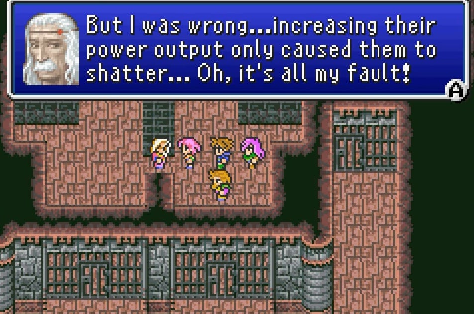 Professor Cid Previa, who created the machines to amplify the power of the crystals, realizes that they have to be stopped. But his attempt to change crystal policy leads to his imprisonment. The people are set in their ways and refuse to change. When your party attempts to stop the Fire Crystal, but fails, the entire kingdom is destroyed. Cid broods in despair, feeling responsible for everything thatâs happened. Nothing you do can convince him to help your further. Itâs a sobering and depressing moment that made me wonder: Why donât people ever listen to messages of imminent doom until itâs too late?
