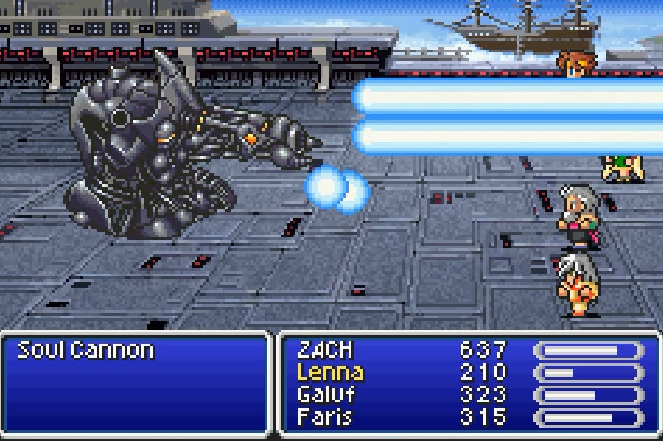 Thereâs one airship battle that I died on a bunch of times. Itâs the boss called the Soul Cannon with a countdown that will release a destructive wave blast. The first few times I fought the cannon, I tried to overpower it, using powerful Thunder spells and enchanting blades with Thunder to try to whittle away at its HP. But since it was draining my HP constantly, just surviving the cannon fire wasnât enough. I tried different combinations of Mystic Knights, Monks, Black Mages, and Summoners. I even brought out lightning scrolls with my ninjas. I still died. I hoped leveling up my characters would help, but they did little against the powerful Diffusion Beam.