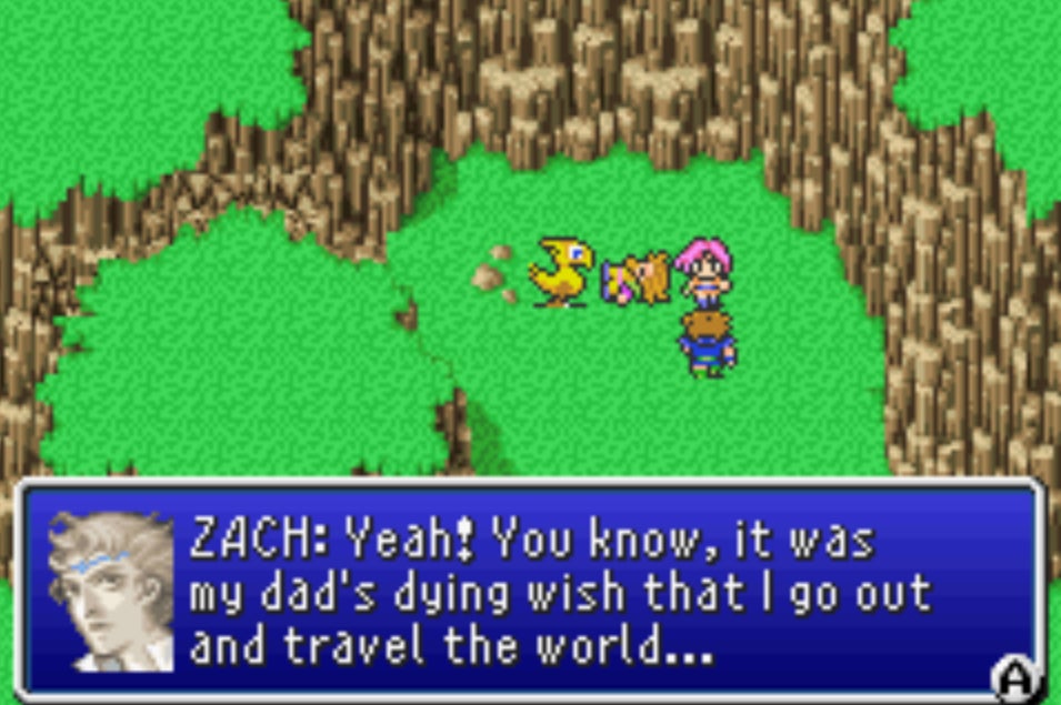 I loved the way this was done in simple scenes with minimal dialogue and music. Itâs amazing to me that a game could convey so much emotion through these 16-bit sprites. I cared about Bartz, could imagine him traveling the world with his grieving father, and understood more about him the first time we meet him as a wanderer without any real companions aside from his chocobo, Boko.