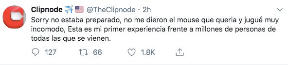 Clipnode, who is from Argentina, tweetedhis thoughts in Spanish, which translate to “Sorry I wasn’t prepared, I wasn’t given the mouse I wanted and I played uncomfortably. This is my first time playing in front of millions of people who came.” (Correction 11:45pm— “Uncomfortably” was previously translated as “awkwardly.”)
