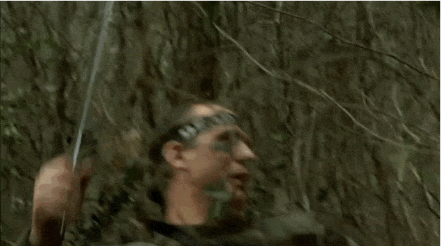 Weapons: Machete (7X), sleeping bag over fire, bow ‘n arrow, screwdriver, axe, impaled on, deer antlers, fireplace poker