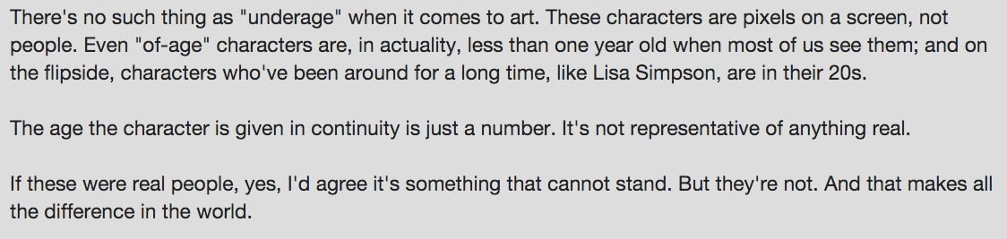 Are we to presume pornographic images of Lisa Simpson are acceptable because The Simpsons has been on the air for 27 years? It’s hard to imagine many people buying that, and this opens the door to the thorniest issue of all: cultural differences on sex in popular media.
