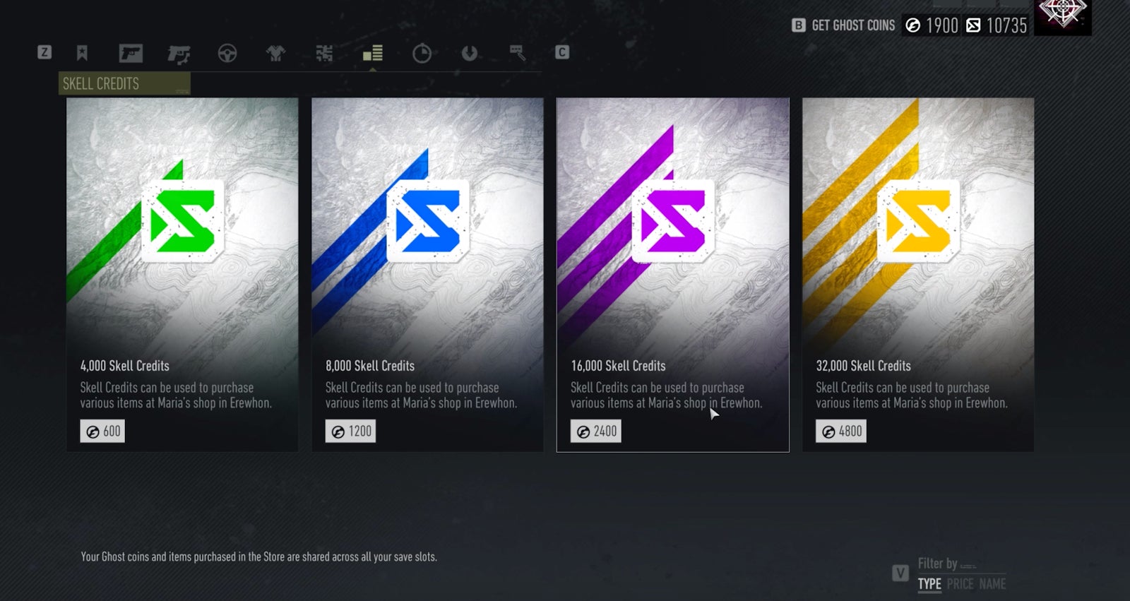 Breakpoint has two currencies. The first are Skell credits. These are the basic unit of currency in the game, gained through looting fallen enemies and completing missions. Skell credits are spent at a shop back at your home base, where you can purchase a few things. There’s a random collection of weapons to buy, all of which tend to be of a slightly higher gear score than what you currently have. You can also buy modifications for your weapons or a small range of cosmetic items like sunglasses, flak vests, and other attire. If you have found weapon blueprints by exploring parts of the game world, you can buy the weapon as well. Skell credits are extremely easy to come buy, especially if you sell off excess gear. However, you can purchase them and use them in the basic shop. For example, you can buy 8,000 credits for 1200 Ghost Coins, the premium currency, which you buy with real money. That many Ghost Coins can be obtained for about $10.