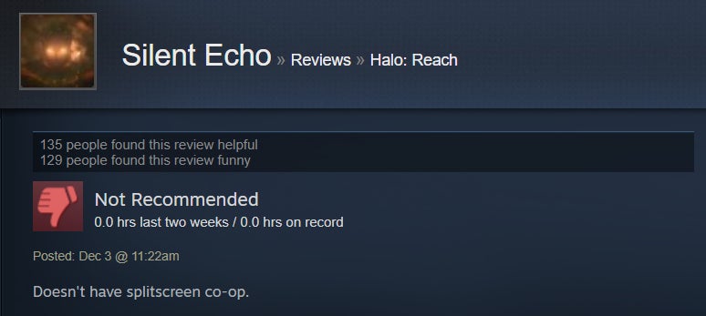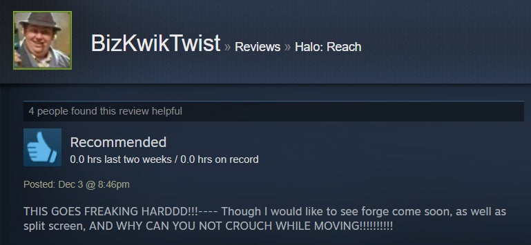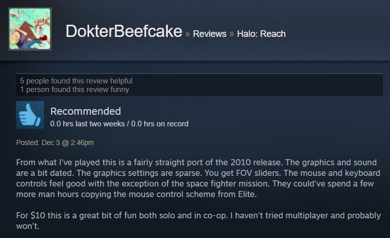 For the most part, Halo: Reach’s PC port is a case of “what you see is what you get.” It’s Halo! The one subtitled Reach, specifically! Now, though, it’s in 4K and can run at 60+ frames per second. Many Steam users are luxuriating in the bubbly, warm nostalgia that accompanies cracking open a 2010 shooter about a squad of extremely doomed space marines just trying to do their best (something we can all identify with). The port, however, isn’t the most elaborate, and it’s got some issues in the control and audio departments. Steam users have also been outraged to find that Reach on PC doesn’t have splitscreen co-op, and frankly, I can’t blame them. I mean, it’s Halo, people—come on.