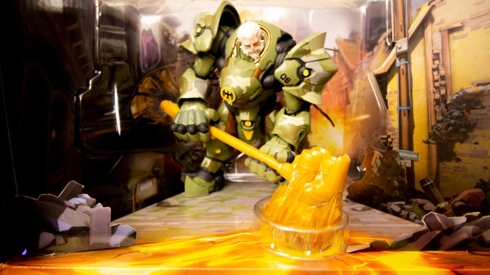 Available exclusively at the Hasbro booth during San Diego Comic-Con, the Bundswehr version of Reinhardt strips the mask off of Overwatch’s best tank, letting the poor old man breathe easy for a bit. The eight-inch tall figure comes packaged in a large box, frozen against a cardboard backdrop of combat chaos.Reinhardt’s hammer, which is gold instead of the silver and gray of the original figure, sports a translucent yellow impact effect. It’s a lovely box, the sort that collectors might want to keep sealed for shelf display.