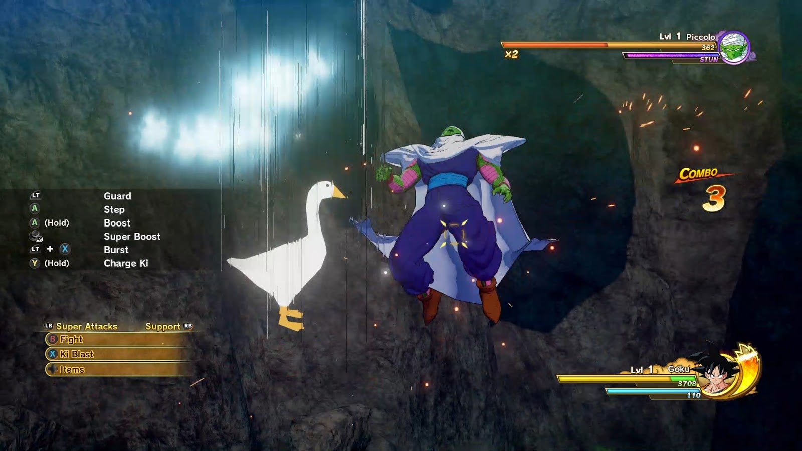 The goose mod, featuring the star of the Untitled Goose Game, does not feature custom animations; the game doesn’t support them. Instead we get this static goose sliding, jumping, and flying around. One moment he’s battling Piccolo …