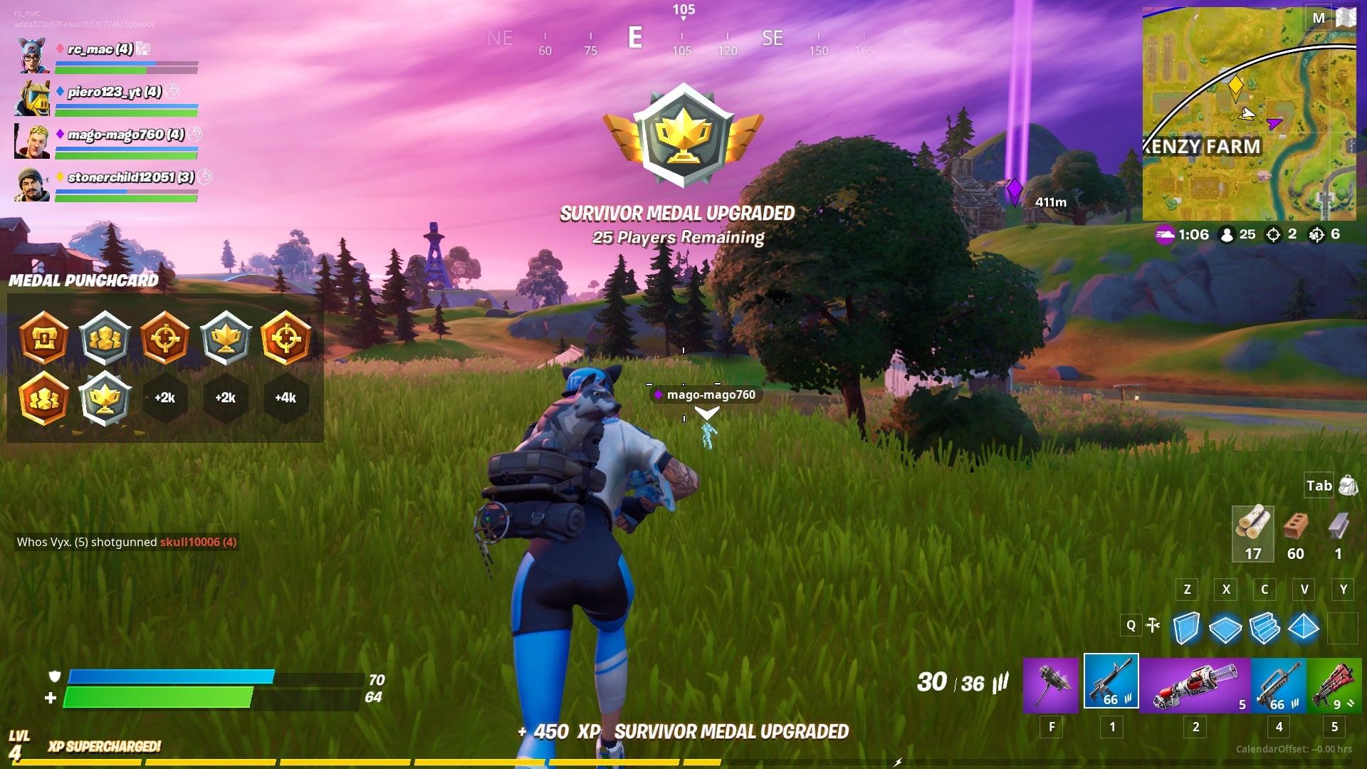 At the left side of your lobby you’ll see a “medal punchcard.” There are 10 medals on the card, which refreshes once a day. The fifth and tenth medal reward 4,000 XP, while the others reward 2,000. You get medals for routine stuff you do during play, such as scavenging and surviving. As far as I understand it, you upgrade the medal by doing the thing it rewards you for more—search enough chests in a match to get a bronze medal, for instance, and, if you keep searching chests, you’ll get a silver one. Once you get 10 medals, you have completed your punchcard and earned all the bonus XP it provides. Once you complete the punchcard you can still earn medals, but you won’t get the big XP bonus.