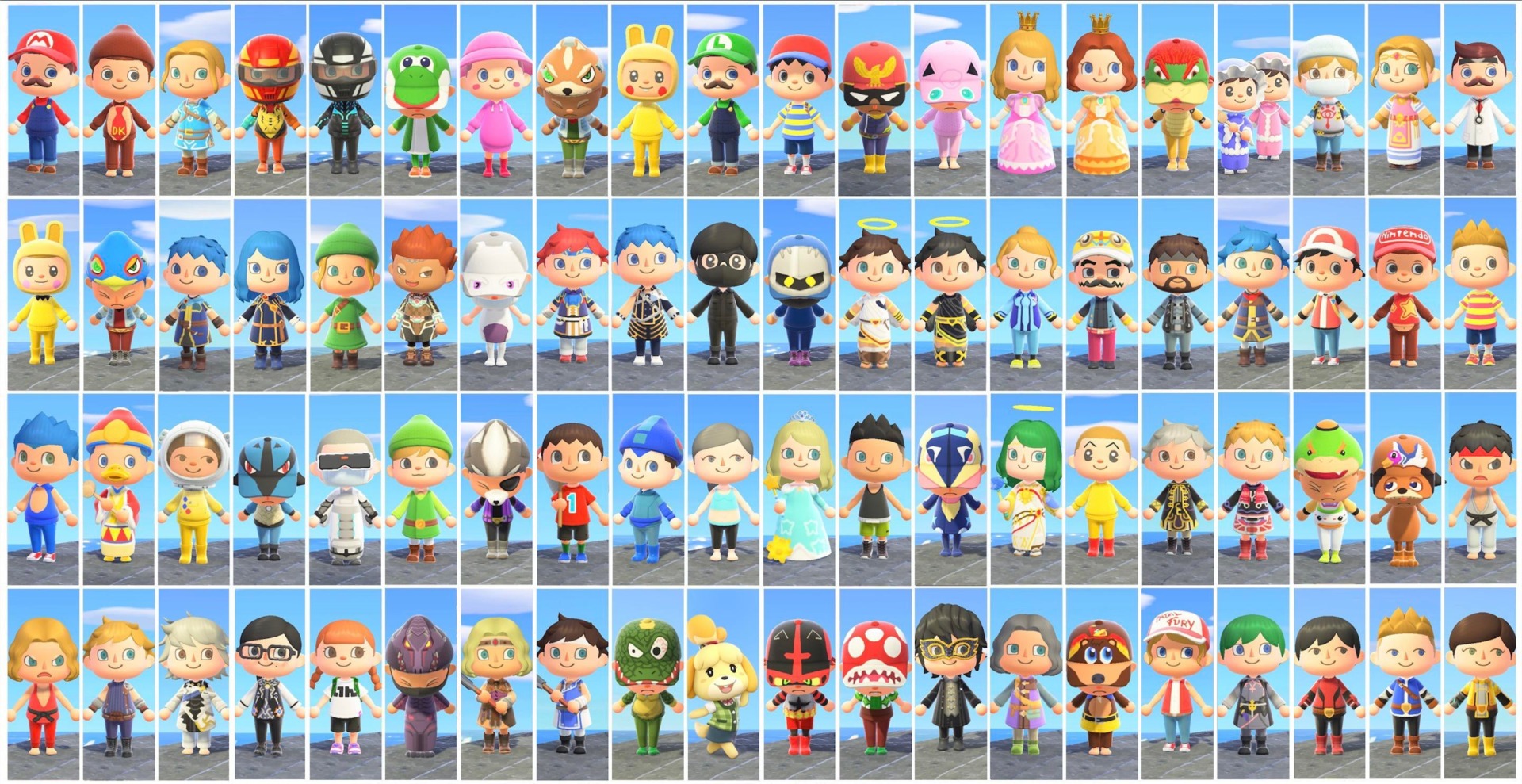 There are those who create custom clothing in Animal Crossing, and there are those who wait patiently for other people to put in the work. Iām in the latter group, and our waiting has paid off big time. DJ-Dezās designs make creative use of hats, helmets, and specific hairstyles to capture the essence of Pikachu, Mario, Link, Captain Falcon, Solid Snake, Lucario, Sonic the Hedgehog, and Iām not going to list them all individually, just look at the image up top.