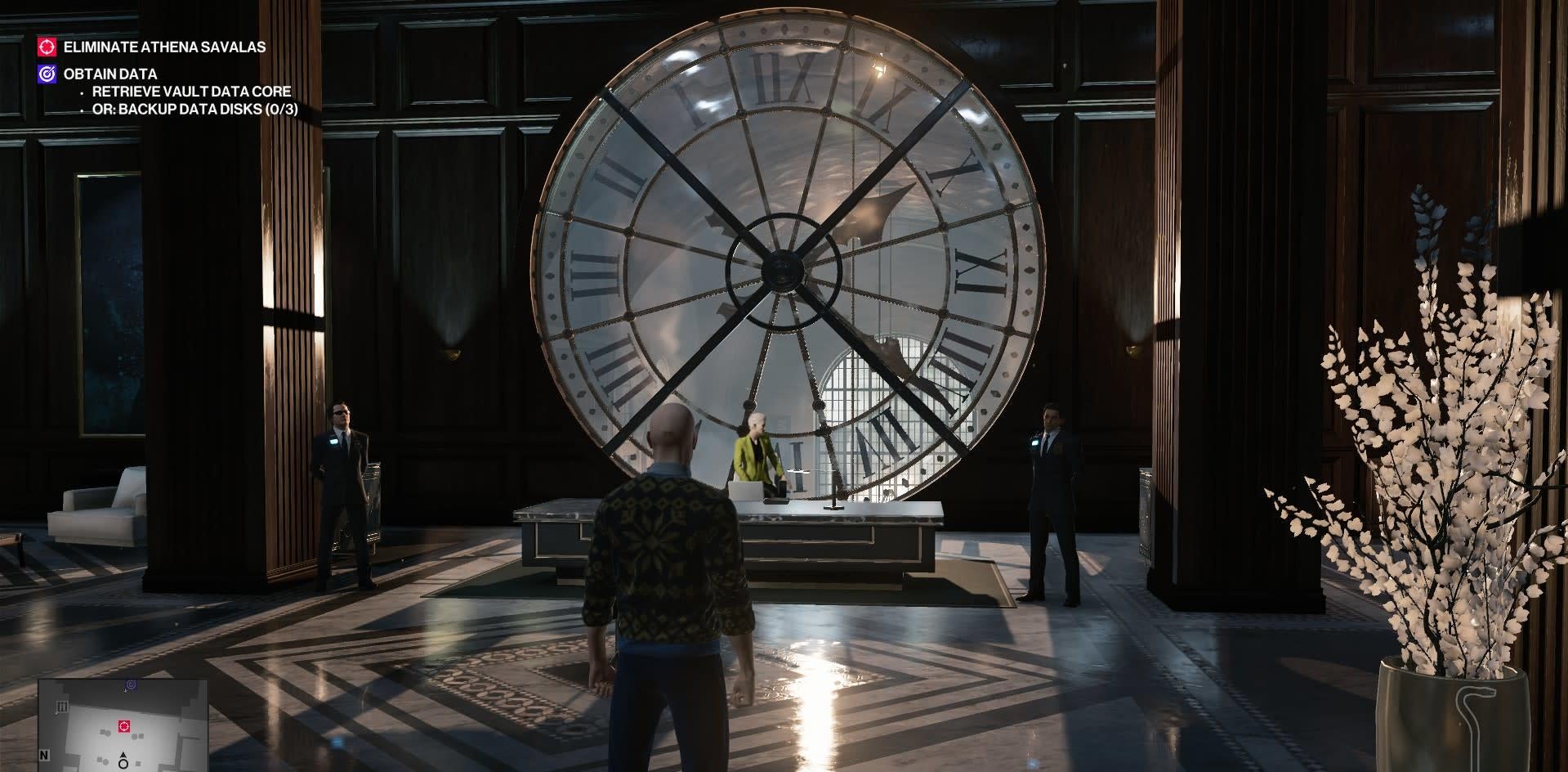 The Golden Handshake involves infiltrating the Milton-Fitzpatrick investment bank in New York City to steal some data related to the identity of three partners of the series’ evil Providence organization. There are a couple ways to do this: stealing the data from the bank’s heavily-protected vault, or snagging pieces of backup records from three targets who are roaming the bank. There’s an assassination assignment, too: the bank’s director, Athena Savalas, who’s holed up in an impressive office with a giant clock.
