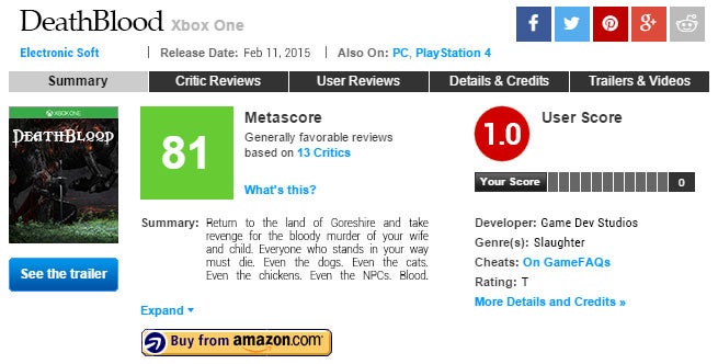 February 10 â DeathBloodâs review embargo expires. Every (other) major video game site on Earth publishes their verdict of the game simultaneously. DeathBlood receives largely positive reviews (general complaints being that the game was âshort on content and even shorter on new ideasâ), earning a Metacritic rating of 81%. Its user rating, however, stands at 1.0 (out of a possible ten), fans complaining about everything from the state of multiplayer servers to feminist critiques in reviews to the spelling of the gameâs name.