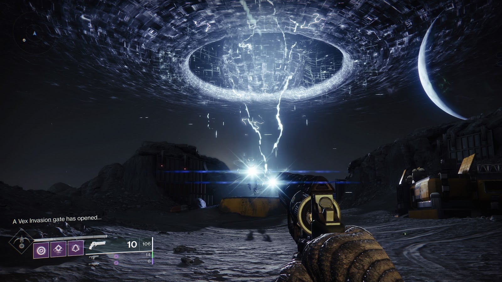 Icons on the Moon map shows potential Vex invasion in three spots, one near where I waited, the other two near Archer’s Line and up north near Hellmouth. You could try driving around to each one, looking for a storm. I just hung out in Anchor of Light, took a phone call, and picked off the handful of Vex who kept spawning in as advance scouts or something. Eventually the storm began.