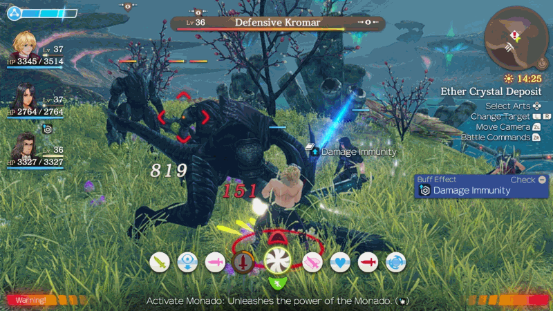 When an Art is marked by a blue exclamation point [7], that means you have a “Chance!” and can trigger a bonus effect, if you act quickly. Maybe that means an enemy is Toppled and thus susceptible to Dazing. Maybe that means Shulk’s Back Slash will be able to deal double damage, because you’ve positioned him just right behind an enemy. Whenever you see the blue exclamation point, it’s usually a good idea to use that Art.
