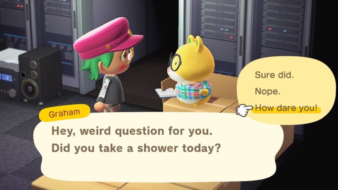 And so I began a two-week experiment. Every day, I filed complaints to Isabelle about Graham acting inappropriately, which unfortunately felt an awful lot like snitching (my girlfriend rightfully asked if Isabelle was a copâI couldnât answer her question). For the first week, I bonked Graham with my bug net every time I saw him for good measure. Over the second, I made a conscious effort to speak frequently with every other villager while icing him out and running away whenever I saw him. I thought surely heâd get the message, but nothing came of it. In fact, some of my favorite villagers approached me considering whether they should leave the island to broaden their horizons (I said no!). All the while that hamster menace hung around the island I worked so hard on, sipping his orange juice, utterly oblivious to my hatred.