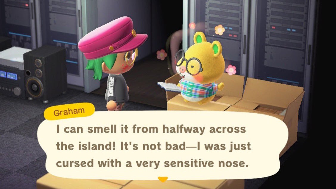 You might wonder what it was about Graham I found so unpleasant. If I were being polite, Iâd say he simply didnât fit with the rest of my neighborhood. If I were not being polite, Iâd say he was ugly, his personality was ugly, and he was killing my island vibe. Bussy Beach had always been a haven for chill eccentrics and sweet little weirdos like Lucky the mummy dog or Mira the cosplay bunny. Sure, we werenât all perfect. Bamâs constant workout talks occasionally worked my nerves, and entertaining Wendyâs delusions of popstar grandeur could be a bit taxing, but nonetheless they had endeared themselves to me and I could accept them, flaws and all. This wasnât the case with Graham.