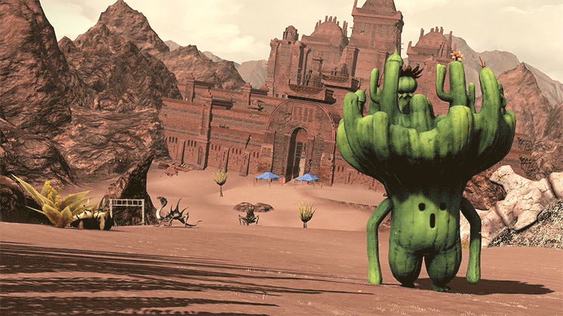 Cactuar are called Sabotenders in Final Fantasy XIV, using the Japanese name to differentiate them from the endless parade of cactus-shaped creatures and summons that have appeared since the creatures debuted in Final Fantasy VI. Garden (rock garden, I suppose) variety Sabotenders are a common sight on the MMO’s continent of Eorzea. Gigantenders are native to the Shadowbringers’ expansion’s land of The First and are adorable enough that I just want to sit in The Fields of Amber and watch them nearly topple all day long.
