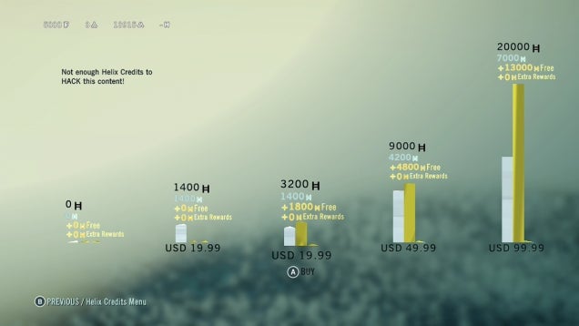 I could stop working on this memory, instead grinding on side missions and locating chests until I have enough Livres to buy more powerful gear. Instead, I open up the eStore and without first looking into what I can buy with Helix credits, opt for the $100 package, the biggest in-game purchase available from Ubisoft, a publisher that would presumably love for me to buy it.