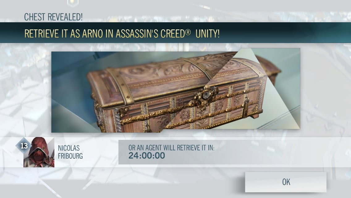 But I persevered, finishing glyph puzzles, grinding appointment missions and collecting Nomad Points in the companion app until I unlocked a blue chest in the game. This was my sole incentive for using the companion app. Once I unlocked a chest, I was instructed that Arno could pick it up in-game or else an agent would retrieve it in 24 hours. I went to (what I think was) the chest in-game, tried to open it and was met with the familiar “Play Nomad Missions in the Assassin’s Creed® Unity Companion app to open this chest.”