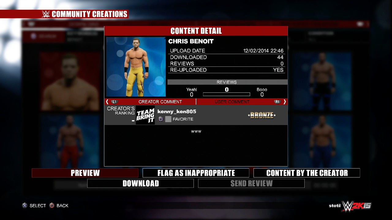 WWE 2K15 game. He doesnât appear alongside the likes of Randy Orton, Bray Wyatt and Stone Cold Steve Austin. But fans can add to the roster through the gameâs âcreate-a-wrestlerâ mode and then share those new characters online for others to download into their copies of the game. To an extent, theyâve succeeded. Alongside fan-made versions of former WWE stars such as Mr. Perfect and non-wrestlers such as Superman, WWE 2K15âs community creations page, as of mid-week, showed numerous fan-made Benoits.