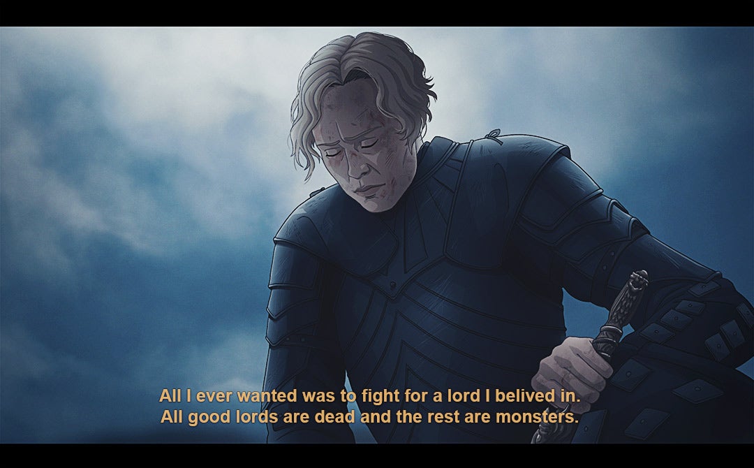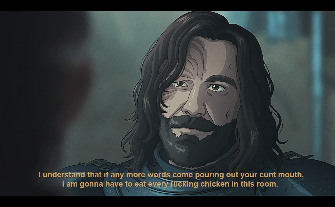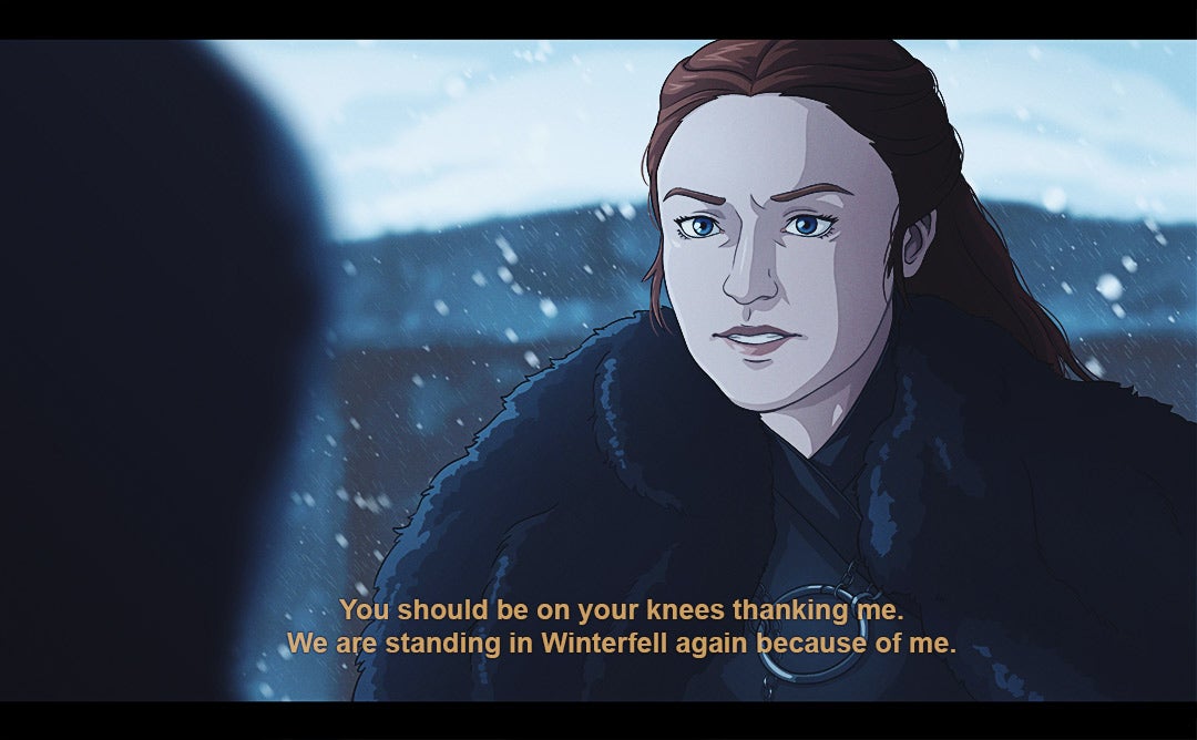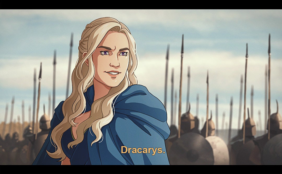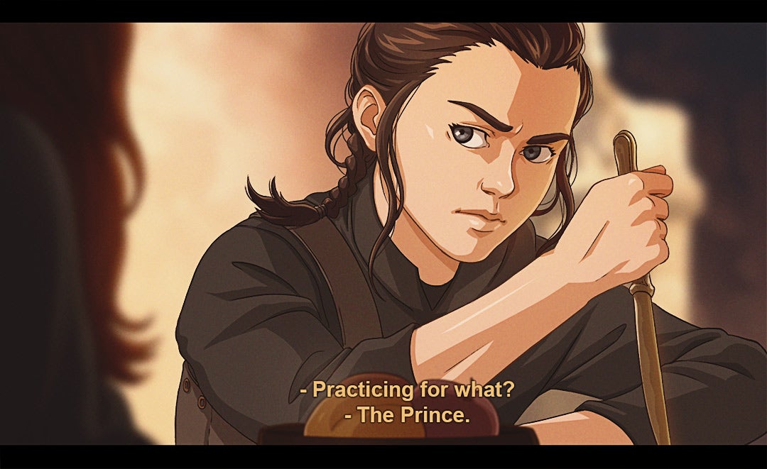 Since 2017, Carolina has been turning key lines/moments from the series into stills from an anime, with a style that’s inspired by stuff like Berserk and Savin Yetman-Eiffel’s Two Queens