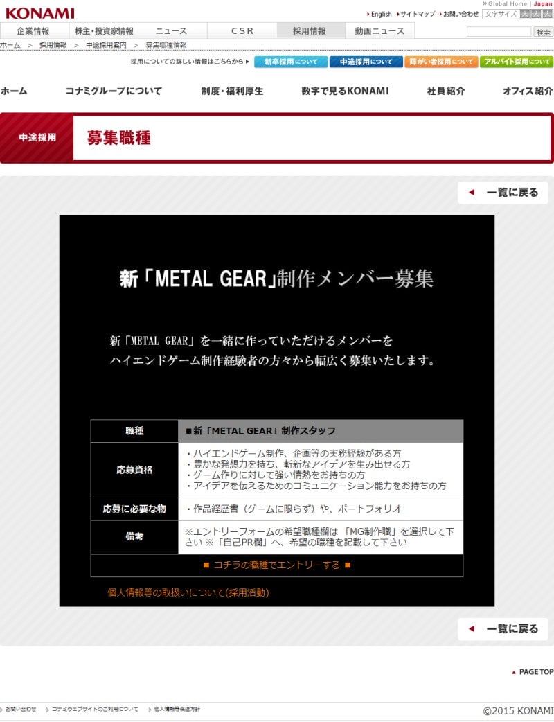 The following day, Konami released a statement pledging to make more Metal Gear games and even set up a recruitment page for a “new” Metal Gear title.